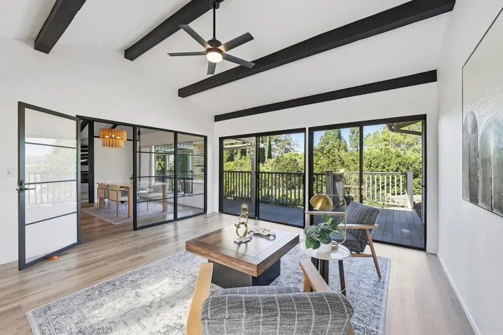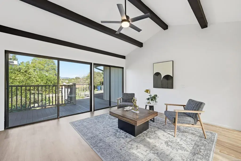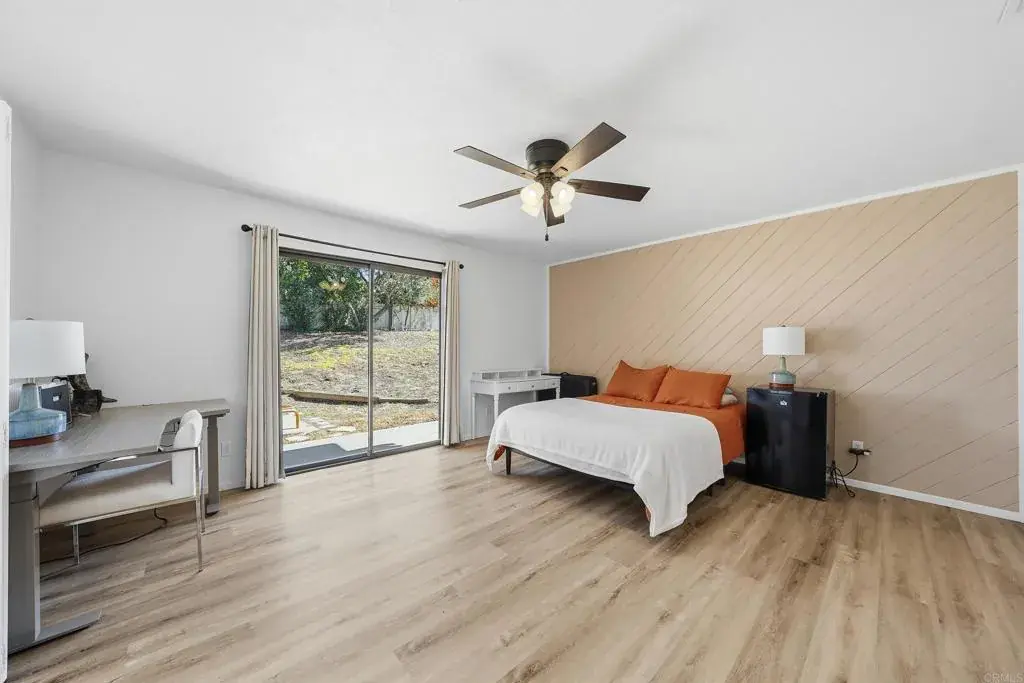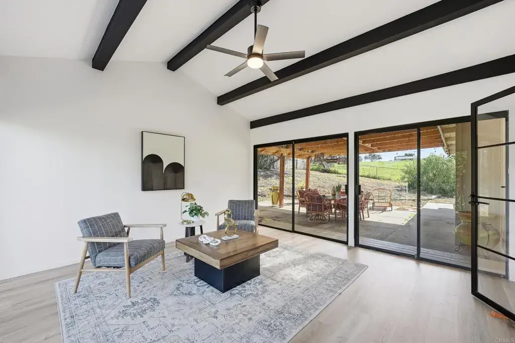 Located at the end of a quiet, tree lined cul de sac in beautiful Fallbrook, this single story ranch style retreat offers the perfect blend of peaceful country living and modern comfort. Completely refreshed and thoughtfully updated, this property delivers both charm and functionality on approximately half an acre of usable land. The main home features three spacious bedrooms and two full bathrooms, enhanced with all new flooring throughout for a clean, cohesive feel. The large living room showcases vaulted wood beamed ceilings and a cozy wood burning fireplace, creating warmth and character while maintaining a modern aesthetic. The kitchen has been beautifully updated with a fresh, contemporary design, offering modern finishes, updated fixtures, and a layout that flows seamlessly into the separate dining room and bright sunroom. Both bathrooms have been upgraded with stylish tile work and updated finishes, giving the home a polished, move in ready feel. The spacious primary suite includes private access to the backyard, creating a seamless indoor outdoor lifestyle experience. The fully equipped ADU has also been updated, featuring its own private entrance, bedroom, bathroom, kitchen, and living area. With new flooring, modern touches, and updated tile finishes, this space is ideal for multigenerational living, guests, or generating rental income while maintaining privacy from the main residence. Outside, the property continues to impress. A producing orange grove with over two dozen fruit bearing trees adds to the charm and character of the grounds. The private backyard offers beautiful western-facing views, especially at sunset, while the wrap-around porch has been upgraded with Trex composite decking an investment of over $20,000 providing the perfect place to relax and enjoy the peaceful surroundings. Additional highlights include a two car attached garage, an extra long driveway with ample parking, RV parking, a dog run along the side yard, and a basement with workshop and storage space. All of this is just minutes from shopping, dining, and major access points, and only 10 minutes to the Naval Weapons Station and Camp Pendleton. This is a rare opportunity to own a fully updated home with income potential, land, privacy, and convenience all in one exceptional Fallbrook location.