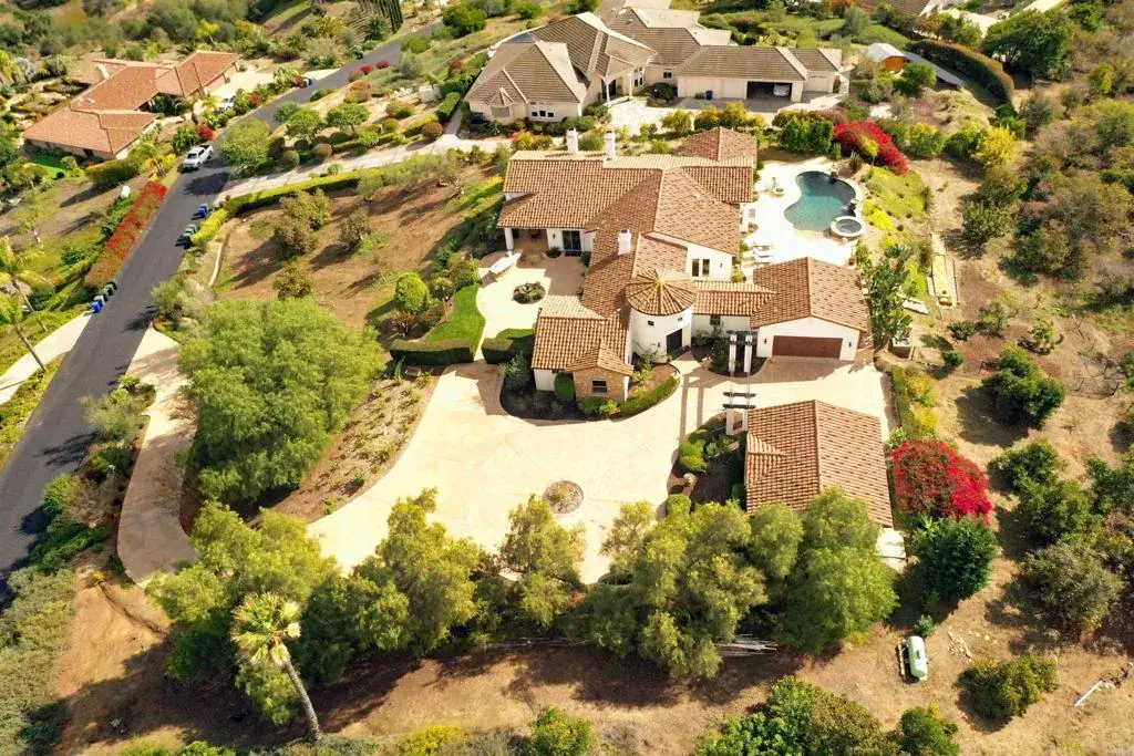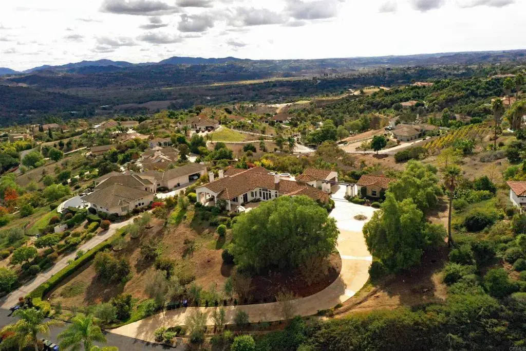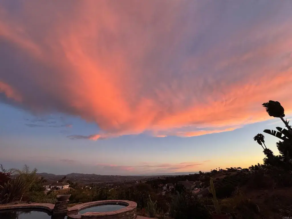 PANORAMIC Views! This stunning updated 4BR/5.5 bath home with a detached casita is perched on 1.58 acres hidden from neighbors. This exquisite single-story estate is a stunner! Offering 180° views stretching to the northeast and southwest—capturing rolling hills, vineyards, orchards and spectacular sunrise & sunsets in complete privacy. The beauty of Fallbrook and its nature surrounds you from the outside and flows inside with expansive windows to bring the nature in! Nestled inside the exclusive hillside gated Champagne Crest neighborhood – a true hidden gem! This property features multiple resort-style outdoor living areas, beach entry pool, three waterfalls, hot tub, fire pit, built-in BBQ, courtyard and a covered veranda ideal for entertaining. The modern Spanish Mediterranean inspired design offers all bedrooms with ensuite full bathrooms, 12ft high ceilings, arched entry’s, an enormous chef’s kitchen including a butlers pantry, built-in bar, formal dining with china cabinet built-ins, 3 fireplaces YES its all pristine and solid high end construction. The primary suite includes direct patio and pool access, a spa-style bath, large walk in closet with built-in cabinetry and sweeping southwest and sunset views from the jetted bathtub. ADU style detached casita with a full bath is ideal for use as a work space, gym or flex space for all your hobbies (multigenerational living). Pride of ownership abounds in this gorgeous custom built home. Private hideaway surrounded by extraordinary vistas for miles. This property is an entertainers delight and a horticulturists dream with over 26 species of tree’s (non certified organically treated). Dual zone AC (2023 improved). A rare opportunity inside Champagne Crest to enjoy privacy, elegance and panoramic Fallbrook scenery in a premier gated community. That countryside feel carries into town—open spaces, big skies, and a sense of tranquility are part of everyday life in Fallbrook. 16 world class golf courses within a few miles, 12 local winery’s (Fallbrook Winery and Monserate Winery adjacent). Fallbrook is the avocado Capital of the World with their renowned annual Festival in April.