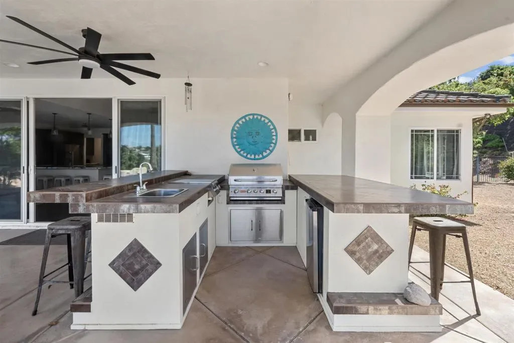Life moves a little differently in Fallbrook—especially behind the gates of Champagne Crest, where wide-open skies, expansive acreage, and vineyard-lined hills create the perfect backdrop for North County living. Just minutes from two championship 18-hole golf courses and award-winning wineries, this quiet and tranquil setting feels like a private retreat while still being close to everything. Double gated with its own private entry, the property offers rare privacy, space for RV or boat parking, and the kind of breathing room that’s becoming harder to find in North San Diego County. Inside, the single-story layout (no stairs!) was designed for easy, everyday living. The large open kitchen and great room become the heart of the home—featuring gorgeous custom slab granite counters, stainless steel appliances, a walk-in pantry, and plenty of space for gathering with friends and family. Pick your own organic citrus right from the property and bring the flavors of the orchard straight into your kitchen. The spacious primary suite feels like its own getaway with custom built-ins, dual vanities, and direct access to the pool for morning swims or sunset dips. The home offers 4 total bedrooms and 3 full bathrooms, including a bedroom with its own exterior entry—perfect for guests, extended family, or a private workspace. A detached shed with a finished interior adds even more flexibility as a storage space, studio, or small office. The enlarged 3-car garage and generous layout make the home as functional as it is comfortable. Outside, the west facing lanai offers a BBQ island made for weekend gatherings, wine evenings after a nearby tasting, or simply enjoying the quiet surroundings. Whether you are looking for your forever home, a property with ADU potential or a second home with the ability for 30+ day income rental, the property offers exceptional flexibility and lock and leave potential. It’s the kind of home where every day feels relaxed, connected to nature, and easy maintenance.