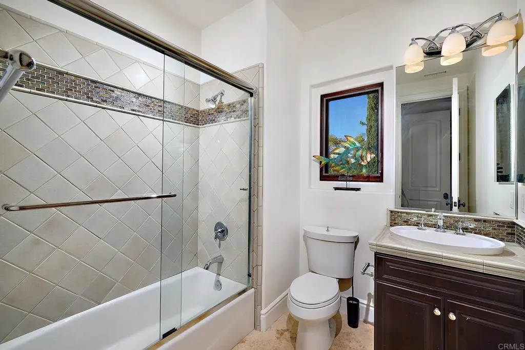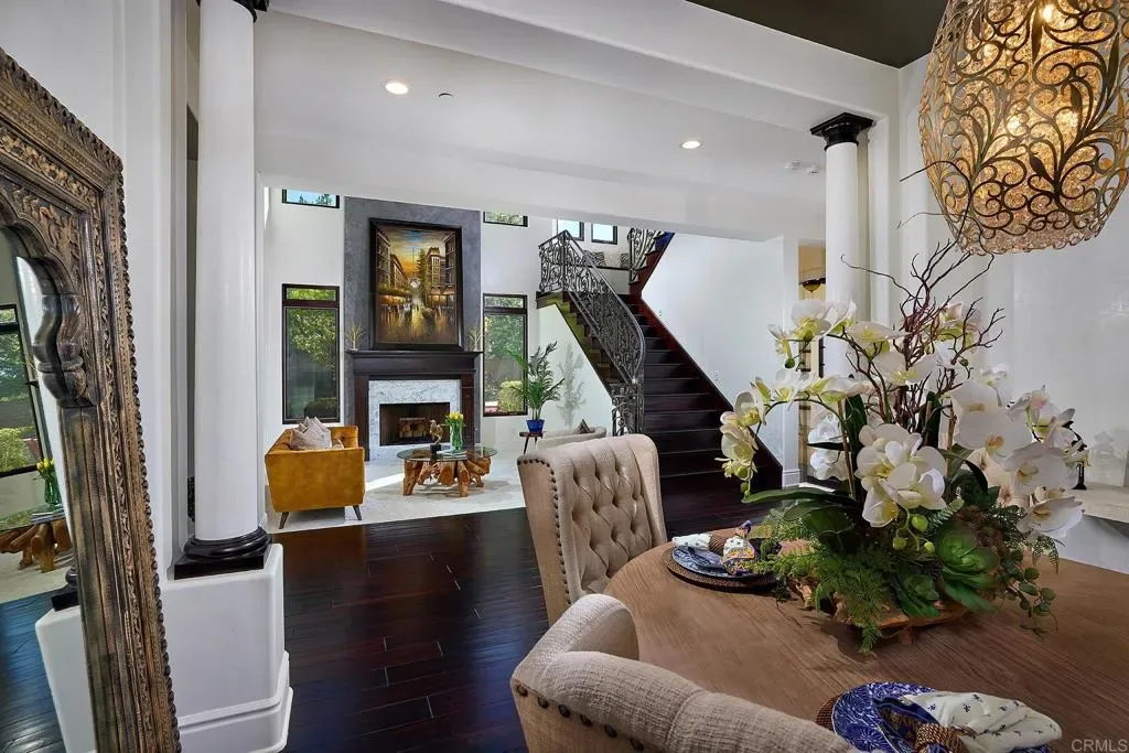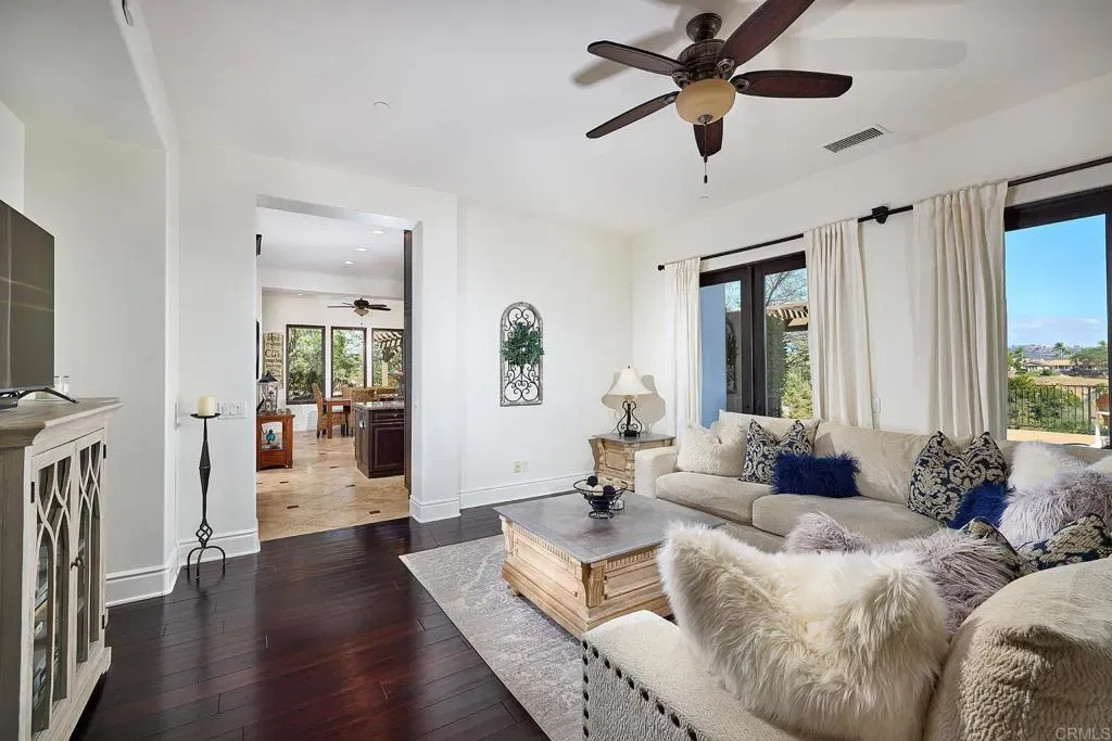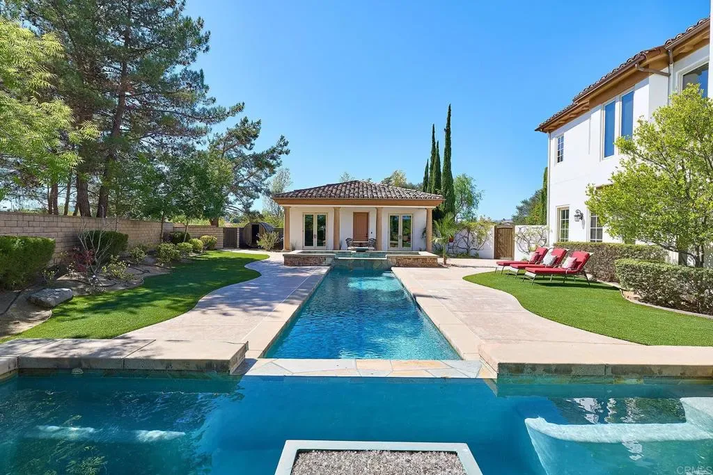 Behind the gates of Malabar Ranch, this Spanish Mediterranean–style estate offers a serene Southern California retreat designed for elevated living and effortless entertaining. Set on 2.11 acres, the residence commands attention with timeless Santa Barbara style stucco, arched windows, manicured landscaping, and a grand sense of arrival. For the car enthusiast, there is an attached 4-car garage and 9,000 lb 4-post car lift. Inside, a dramatic two-story living room sets the tone with soaring ceilings and a graceful staircase, creating an atmosphere equally suited for large gatherings or quiet reflection. The main residence features 5 bedrooms and 5.5 baths, thoughtfully appointed to blend comfort with sophistication. At the heart of the home, the chef’s kitchen is both beautiful and functional, appointed with a Sub-Zero refrigerator, dual ovens, dual dishwashers, and a generous island. From the kitchen sink, enjoy tranquil views of the rolling Fallbrook hills: a daily reminder of the property’s exceptional setting. The kitchen transitions naturally to the dining room, breakfast nook, and outdoor entertaining spaces, encouraging seamless indoor-outdoor living. Outdoors, the estate unfolds into a series of inviting terraces, each oriented to capture the sun’s journey over the hills. Enjoy morning coffee as the sun rises and gather at day’s end to watch the sky glow at sunset. The resort-style pool and spa, cedar-wrapped sauna, and built-in barbecue island complete the experience, creating a private sanctuary that feels worlds away. The detached one-bedroom guest house adds flexibility for extended stays, offering comfort and privacy for visiting family or friends. Balancing scale, privacy, and refined architectural detail, this estate embodies the best of Southern California living – a place where luxury feels relaxed, nature is ever-present, and home becomes a destination.