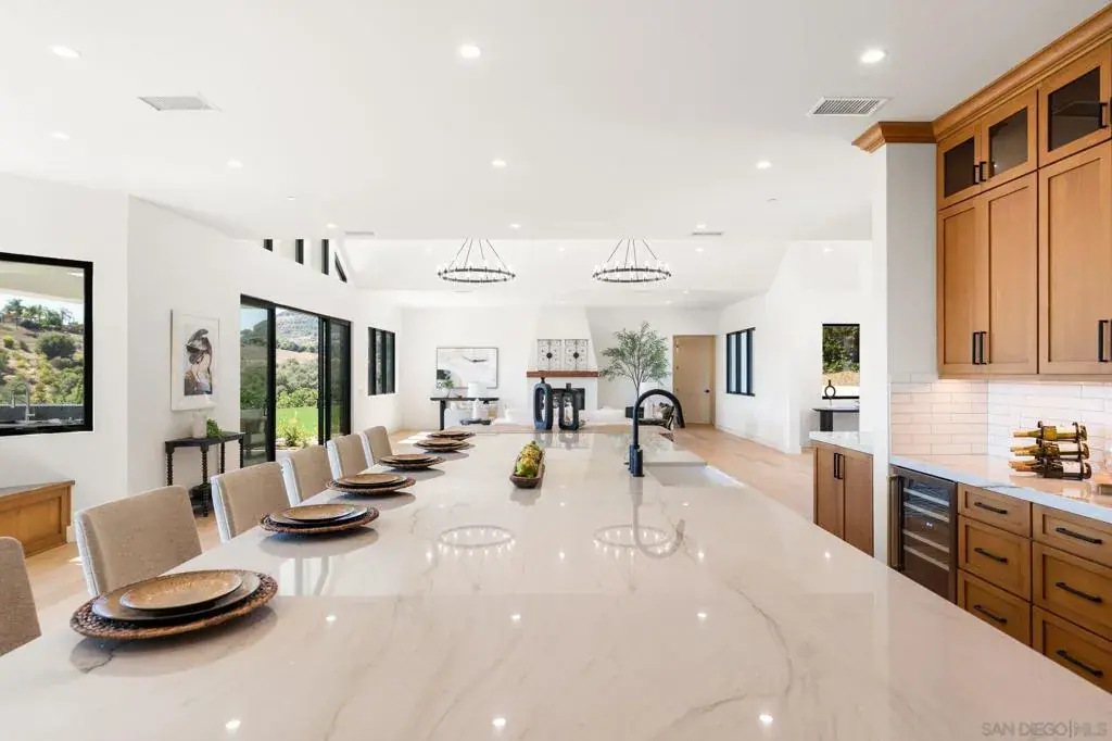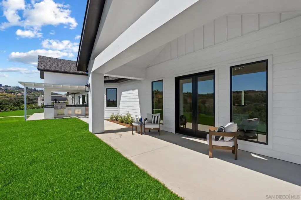 Set in Fallbrook’s exclusive Hill Ranch neighborhood, this brand-new modern farmhouse offers 4,488 SF of single-level living on 2.2 acres. Designed with both luxury and comfort in mind, the home features 4 bedrooms and 4 bathrooms, including a spacious primary suite with a spa-inspired bath and walk-in closet with custom built-ins. Each additional bedroom, including a second large primary-sized suite, enjoys its own fully improved walk-in closet, blending functionality with refined style. The open-concept layout showcases a chef’s kitchen with a large center island, Wolf appliances, and elegant finishes that flow seamlessly into the family room and outdoor entertaining spaces. Expansive windows frame sweeping views and allow natural light to fill the interior, while tasteful chandeliers throughout add timeless sophistication. A gated, tree-lined driveway, solar power, Kohler sinks, Toto toilets, and a generous 3-car garage complete the offering. With superb indoor-outdoor living and every modern convenience, this rare new construction estate embodies the best of luxury living. No detail or expense was spared in selecting the finishes or appliances throughout the home. The kitchen features Wolf appliances and a Sub Zero refrigerator, all bathrooms are complete with Toto brand toilets and Kohler sinks. Hill Ranch is a gated community on the border of Bonsall and Fallbrook that is peaceful, quiet and easily accessible.