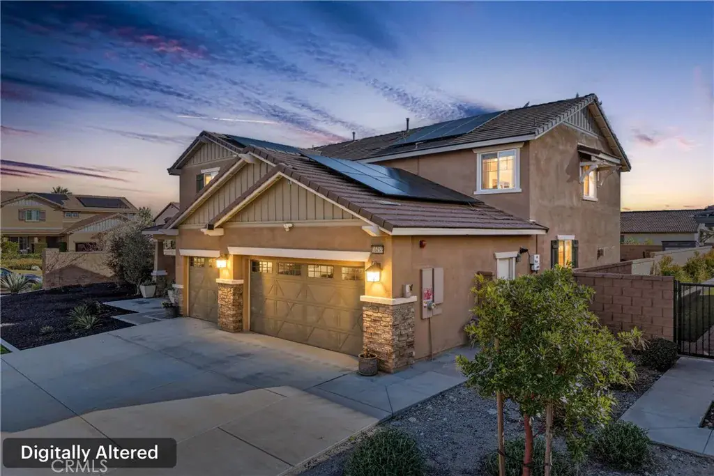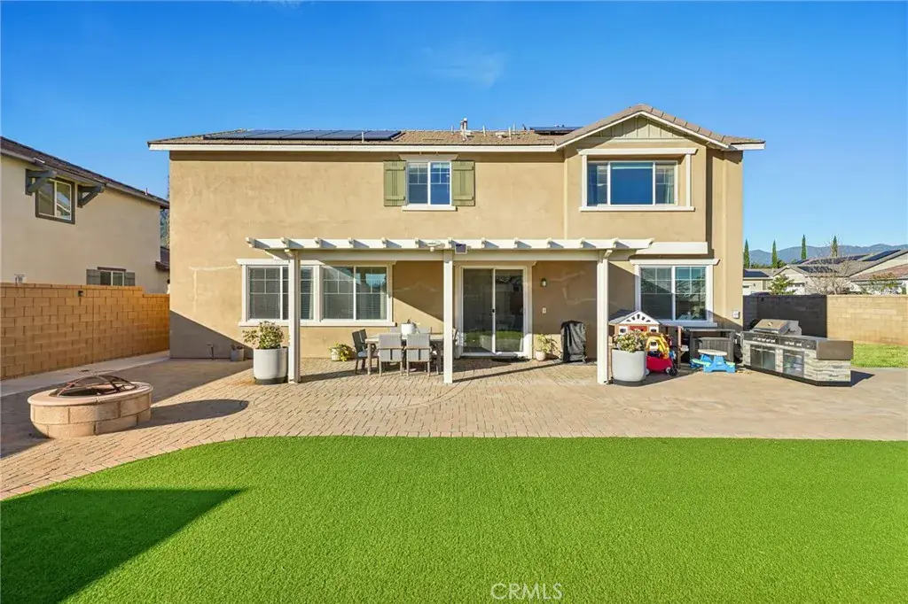 Shady Trails beauty in North Fontana! Located in a gated community with stunning mountain views and leased solar panels. This home features 5 bedrooms and 3 bathrooms with 3,423 Sqft of living space, excellent curb appeal, and an attached 3-car garage. Enjoy a welcoming front porch and custom entry door leading into an open-concept layout designed for modern living. Upgrades include a whole-house fan, dual A/C, and vinyl plank flooring throughout. The den/office can serve as an additional bedroom, along with a versatile flex space. There is one bedroom and one bathroom downstairs. The expansive kitchen boasts granite countertops, a 6×6 island, double ovens, a deep basin sink, stainless steel appliances, recessed lighting, soft-close cabinets, and a walk-in pantry. The Great Room features a custom fireplace and ceiling fan and opens to the dining area. Upstairs you’ll find a spacious loft, three secondary bedrooms, and an upstairs laundry room. The Primary Suite is also on the 2nd floor and includes a massive walk-in closet, as well as a spa-like ensuite with double vanities, soaking tub, and shower. The private, flat backyard offers an Alumawood patio cover, pavers, block walls, a wrought-iron side gate, gas firepit to enjoy, as well as a Suncast shed, custom stacked-stone above ground planters, custom lighting, a sandbox, and a garden area. Residents get to enjoy an array of Resort-Like Community Amenities including pools, spas, basketball courts, pickleball courts, tennis courts, a fitness center, banquet area, and and more! Come enjoy all that beautiful Shady Trails has to offer, and schedule your tour today!