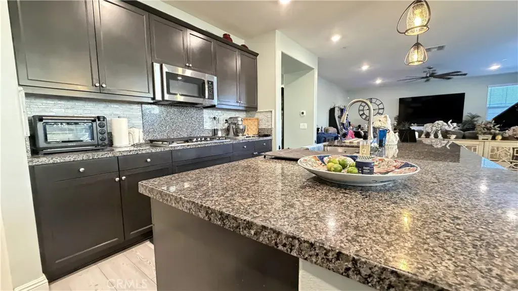 This home is situated within the highly desirable Gabion Ranch community. Residents enjoy access to two resort-style recreation centers with pools and spas, a children’s wetland-style splash play area, and multiple Gabion Ranch parks. The community is enhanced by signature lighted entry monuments at all entrances, creating a warm and welcoming arrival. This exceptional two-story residence features Lennar’s highly sought-after Next Gen® suite, ideal for multigenerational living. It is the only Next Gen floor plan in the community offering a private, gated front patio, providing added privacy and charm. The suite includes a separate entrance, living area, kitchenette, bedroom, full bathroom, in-suite laundry facilities, and the refrigerator is included. The main home offers a bright and open first-floor layout where the Great Room, kitchen, and dining area seamlessly connect—perfect for both everyday living and entertaining. The refrigerator in the main house is also included. Upstairs, three spacious bedrooms are arranged around a versatile loft, ideal for a home office, media room, or additional living space. The home is loaded with upgrades, including 3-inch upgraded baseboards, wood plank flooring throughout the downstairs, primary bedroom, and laundry room, and a kitchen backsplash with upgraded cooktop and grates. The backyard is a true tropical retreat featuring custom planters, a retaining wall, colored concrete, a covered patio, and a 10×10 eight-person dual-jet jacuzzi with cover, included with the sale, plantation shutters on most windows, a roll-up shade at the sliding glass door, and a striking $9,000 upgraded front door with full beveled leaded glass. Most rooms include ceiling fans and light fixtures (select fixtures excluded). Energy efficiency is a standout feature with 27 solar panels, including fully owned panels and nine leased panels from the original builder, providing approximately 98% off-grid living. Average SCE electric bills are approximately $8 in summer and $12 in winter. A dual Tesla battery backup system is available as a negotiable option. A 3-car tandem garage with a ceiling-mounted storage rack is pre-wired for an EV charger, includes a generator hookup for emergencies, and is pre-plumbed for a water softener. A SimpliSafe alarm system and cameras are installed and negotiable. This thoughtfully upgraded home offers flexibility, efficiency, and modern comfort—perfectly designed for today’s lifestyle.
