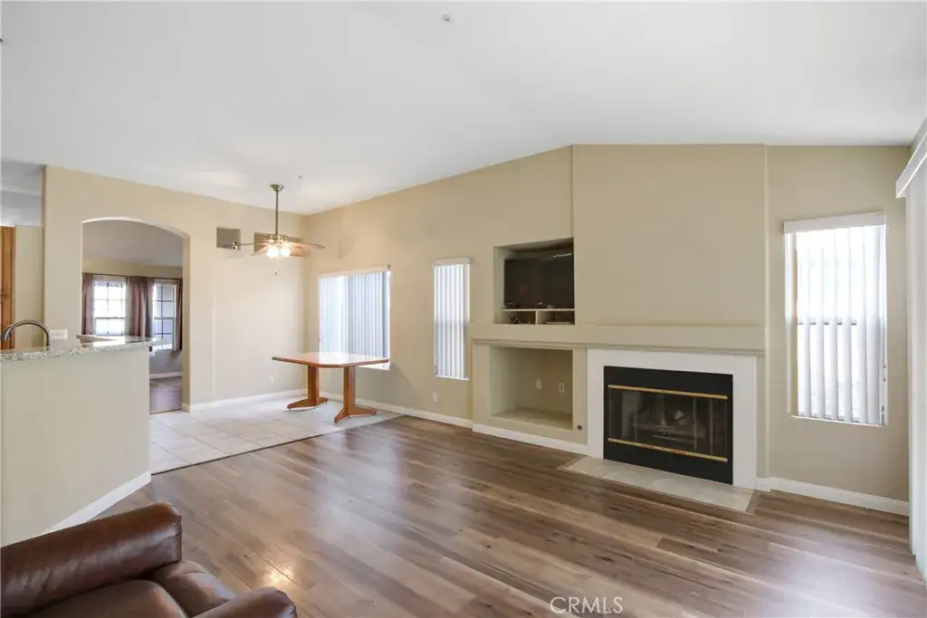Experience comfortable living in this charming 3-bedroom, 2-bathroom single-story home located in the highly sought-after Hunter’s Ridge community of North Fontana. Spanning 1,326 square feet of bright, open-concept living space, this residence features vaulted ceilings and modern wood-look flooring that flows seamlessly through the main living areas. The spacious great room, anchored by a cozy fireplace and dedicated media niche, serves as the heart of the home, perfect for relaxing or entertaining. The updated kitchen is a chef’s delight, boasting elegant granite countertops, a functional breakfast bar, and ample cabinetry. Retreat to the serene primary suite, which offers its own vaulted ceilings and an en-suite bathroom with a double-sink vanity.