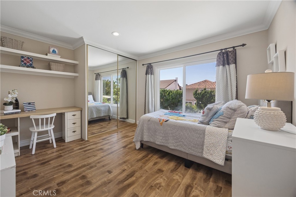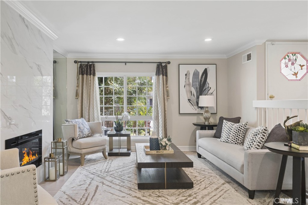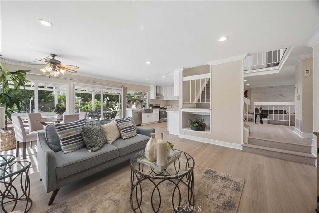 Inside, skylights and large windows bring in abundant natural light, creating a bright and open atmosphere throughout the home. The layout includes multiple living areas that provide flexibility for everyday living, entertaining, or working from home. Crown molding and finished upstairs flooring add thoughtful detail to the interior.