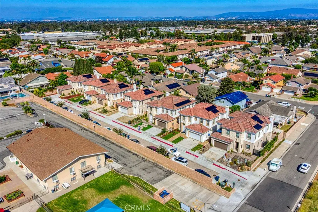 finishes include 10-foot ceilings, marble and wood vinyl flooring, dual-panel windows, LED recessed lighting, raised panel doors, quartz countertops, and designer fixtures. The soaring 21-foot staircase with a Palladium window enhances the sense of space and grandeur. The home is designed for sustainable, comfortable living with central A/C, a tankless water heater, and an advanced PAID SOLAR SYSTEM. Its open-concept layout is ideal for entertaining, featuring a formal living room, a separate dining room, and a stunning family room with a stacked stone gas fireplace. The chef’s kitchen boasts a large quartz center island, soft-close shaker cabinetry, stainless steel appliances. The luxurious primary suite offers a retreat-like experience with dual vanities, a free-standing tub, an oversized walk-in shower, and two enormous walk-in closets. Additional amenities include motion-sensor lighting in all bathrooms and an upstairs laundry room with storage cabinets. Outside, the property impresses with its stacked stone siding, tile roof, spacious 2-car garage, private backyard with a covered patio, and block wall fencing—all nestled at the end of a spacious cul-de-sac allowed up to 9 parking spaces. With its blend of premium features, impeccable design, and prime location near top schools, close to shopping, Little Saigon, and the beach. This extraordinary home is truly a rare find.