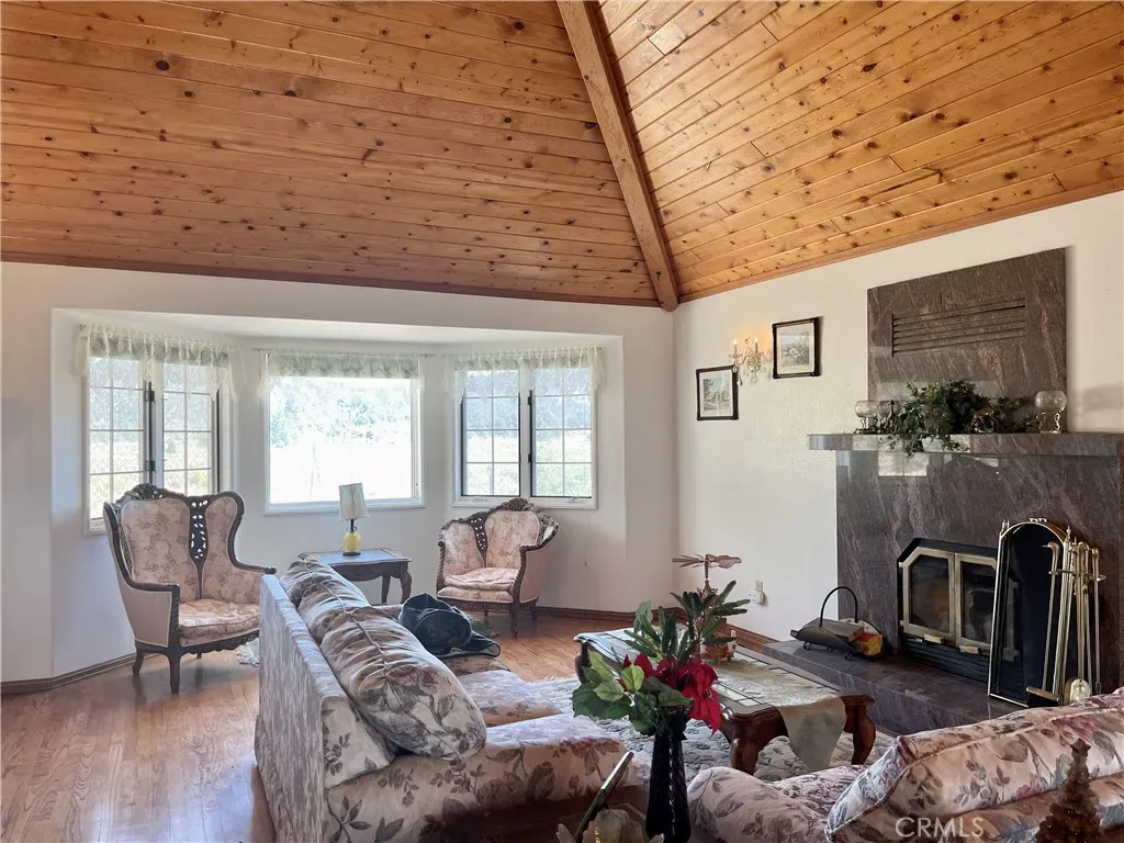 Formal Living Areas: Vaulted wood-beam ceilings, wood floors, fireplace, large dining space, and sunlit sitting/reading area.