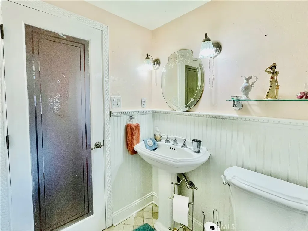 The upper-level bathroom offers true vintage charm with a clawfoot tub, pedestal sink, wainscoting, and tile flooring. Two bedrooms are located on this level, one of which includes a bonus loft area for extra storage.