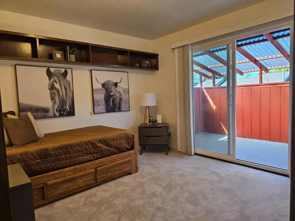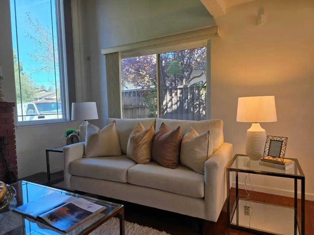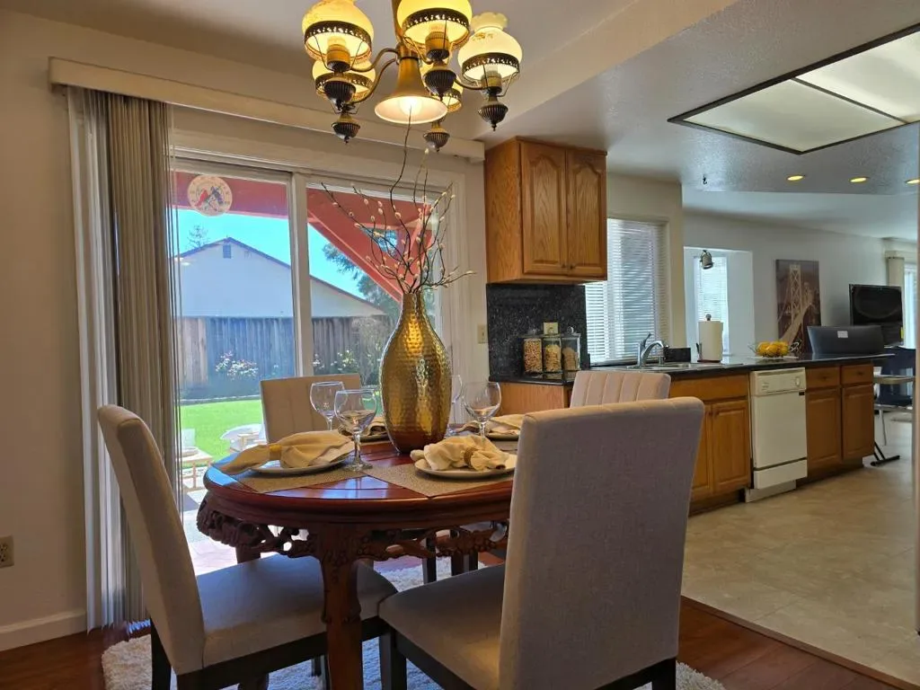 Welcome to this inviting home featuring a stunning vaulted ceiling in the formal living room, a cozy fireplace, & updated flooring that adds warmth & character from the moment you enter. The dining area includes a convenient sliding glass door that opens to the backyard patio, creating an easy indoor-outdoor flow for entertaining. The kitchen boasts premium features, sleek countertops, appliances, ample cabinetry, & a breakfast bar. The spacious family room has a fireplace for cozy winter nights, while a glass sliding door opens to the backyards expansive patio, perfect for relaxation, entertainment, & gatherings. Upstairs, the en-suite primary bathroom impresses with a walk-in closet & sliding glass door to a private balcony. The second bedroom upstairs also has its own sliding glass door leading to a private balcony. Additional features include double-pane windows. A spacious ground-floor bedroom with a hall half-bath offers flexibility for guests, extended family, or a home office. There is also an electric chair lift between the floors for added convenience. Ideally located near the 880 & 680 freeways, Warm Springs Park, shopping centers, Warm Springs/South Fremont BART, & Tesla Fremont, this home offers comfort, functionality, & an excellent commuter-friendly location.