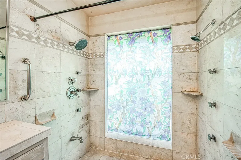 The home offers multiple walk-in closets, providing abundant storage, along with custom stained glass windows that add character and unique architectural detail.