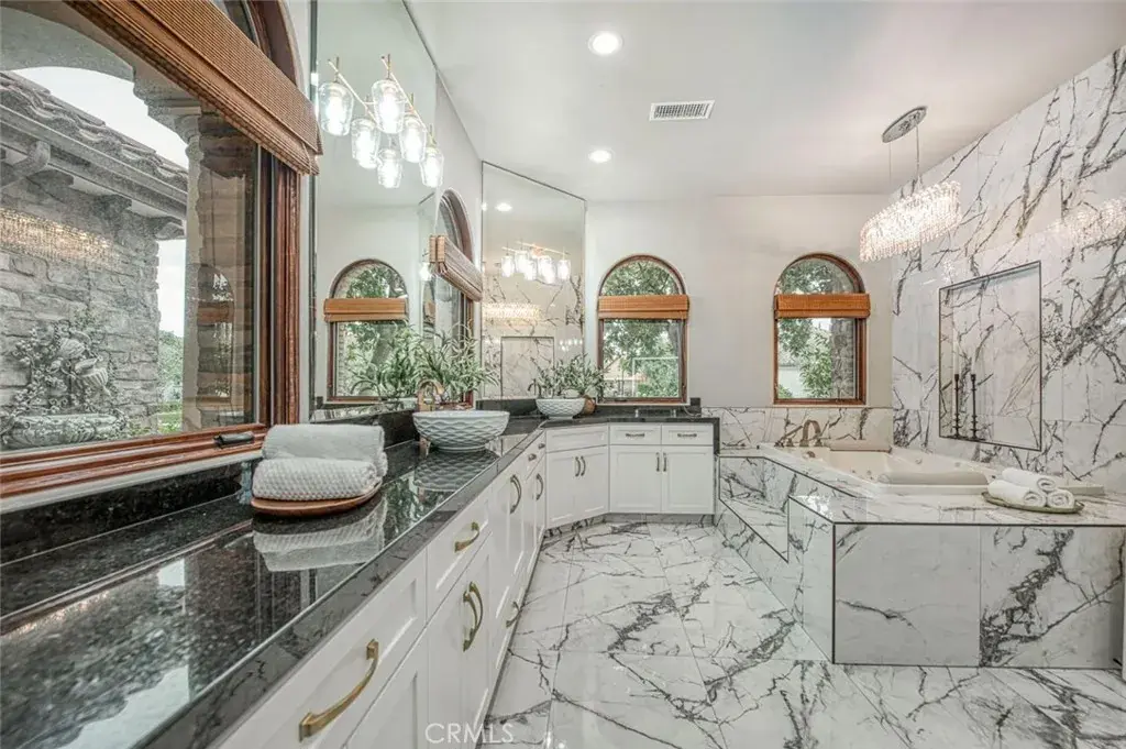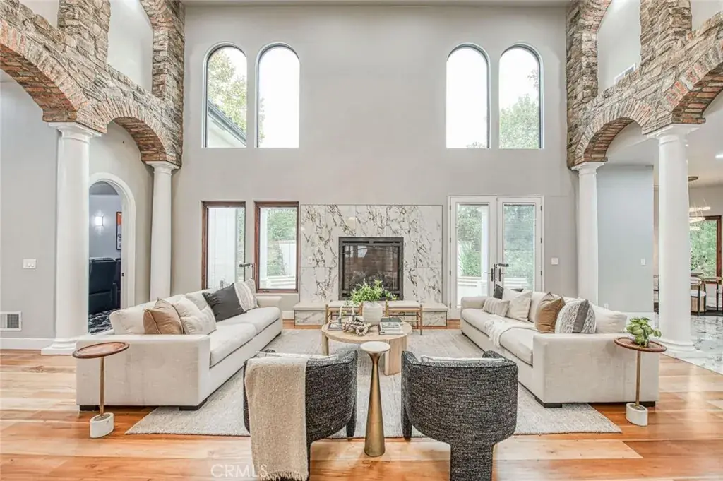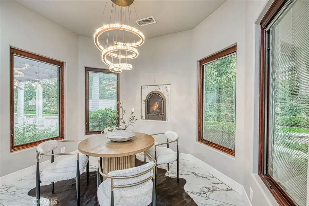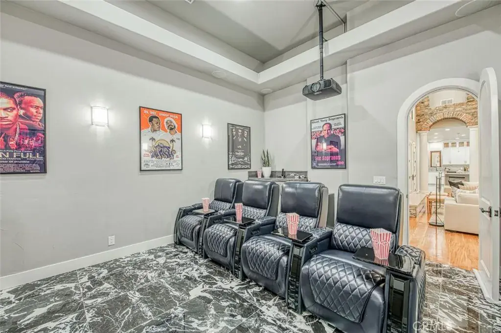 The main-level primary suite serves as a serene retreat, featuring a spa-like bathroom, inviting fireplace, and an expansive custom super closet. Entertainment shines with a cutting-edge, soundproof theater room, while a versatile bonus area off the kitchen easily adapts into a private guest suite or multigenerational space.