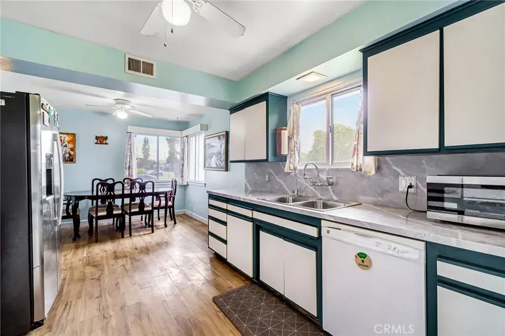 The kitchen has been refreshed with new quartz countertops, freshly painted cabinets, and new vinyl flooring, while hardwood floors run throughout the main living areas and durable vinyl flooring completes the bathrooms.