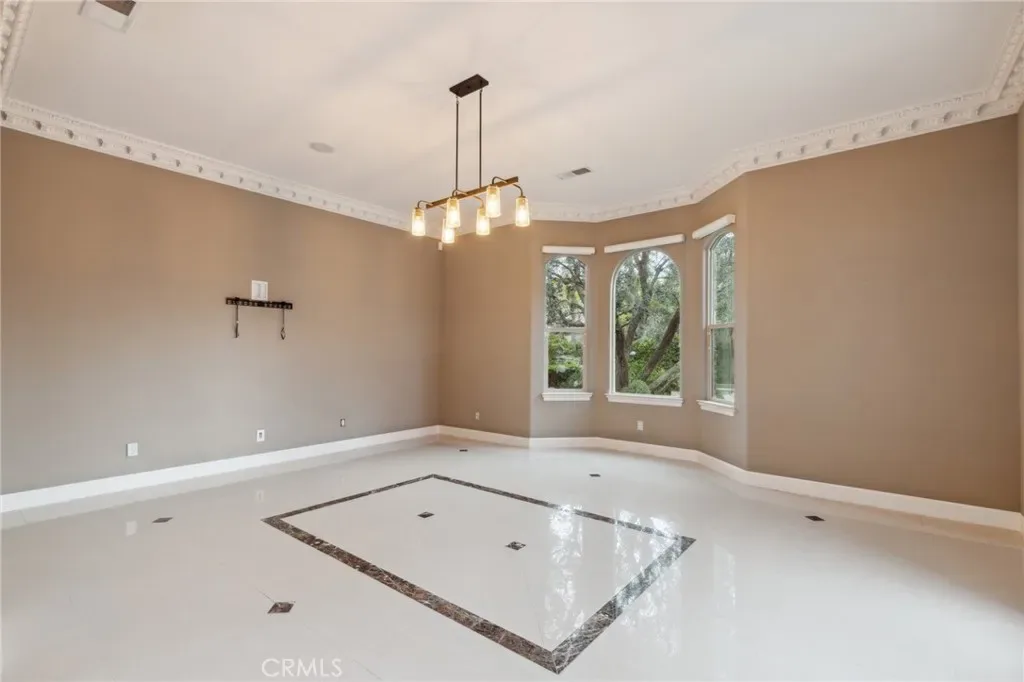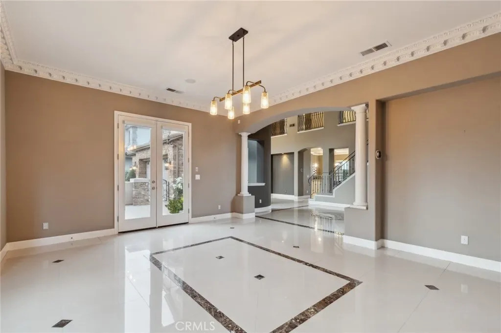Enter through olive tree-lined cobblestone paths into a residence defined by craftsmanship and detail—soaring vaulted ceilings, large porcelain tile with stone inlay, wrought iron stair rails, and dentil-style crown molding throughout. The thoughtfully designed kitchen features custom cabinetry, granite countertops, an oversized island with breakfast bar, and a beautifully crafted custom range hood.