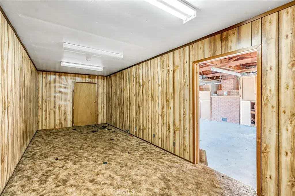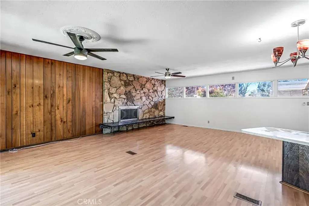 Inside, a dramatic floor-to-ceiling stone fireplace anchors the expansive living area, while warm wood paneling and classic architectural details bring a sense of character that’s hard to replicate. Large glass doors stretch across the back of the home, filling the space with natural light and creating a seamless connection to the backyard perfect for entertaining or relaxing evenings at home.