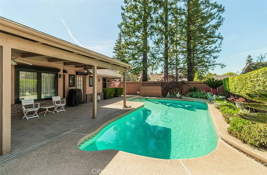 This fabulous, immaculate, Northwest Fresno 4 bedrooms and 3 bathrooms Vintage like custom home exemplifies Old World Charm and European designs throughout. Enjoy this outstanding floor plan with a separate living room, dining room and family room with a lovely gas jet fireplace. The home flows very nicely and has lots of light with loads of designer style windows with their parts made in Europe and assembled in the USA. They are very special as they open from the side and the top. Many of the window coverings are electric like shades/rolling shutters. The wallpaper is from Germany and lends itself so well to the overall feel of this home. The well-appointed kitchen is conveniently located and has an open feeling to the large eating area and a breakfast bar too. The electric cooktop and builtin appliances add to your cooking enjoyment plus a large pantry and loads of storage too. (CD player equipment included) The primary bedroom and bathroom with its own skylight are well designed for privacy and relaxation with a nice walk in closet and deluxe bathroom and double sinks with its own beautifully tiled separate shower and tub. The additional 2 bedrooms on the north wing are nice size with an extra hall bathroom nearby. The large private bedroom on the south side of the home has outstanding builtin bookshelves and can be used as an office etc. In addition, the bathroom and large utility room are nearby. The home includes its own builtin vacuum system. The front and rear yards are easy care and show pride of ownership with artificial turf and beautiful flowers now in bloom. The pool is well designed and situated with a patio for many hours of enjoyment and entertaining. The lovely garage with epoxy flooring has tons of storage including a pull-down attic area .