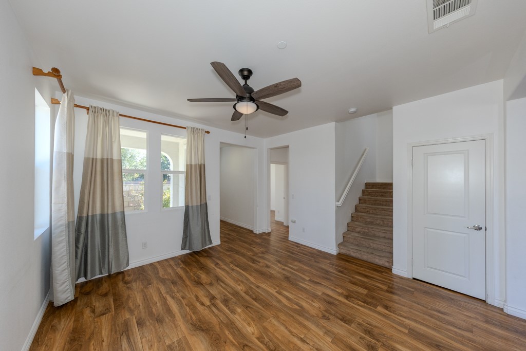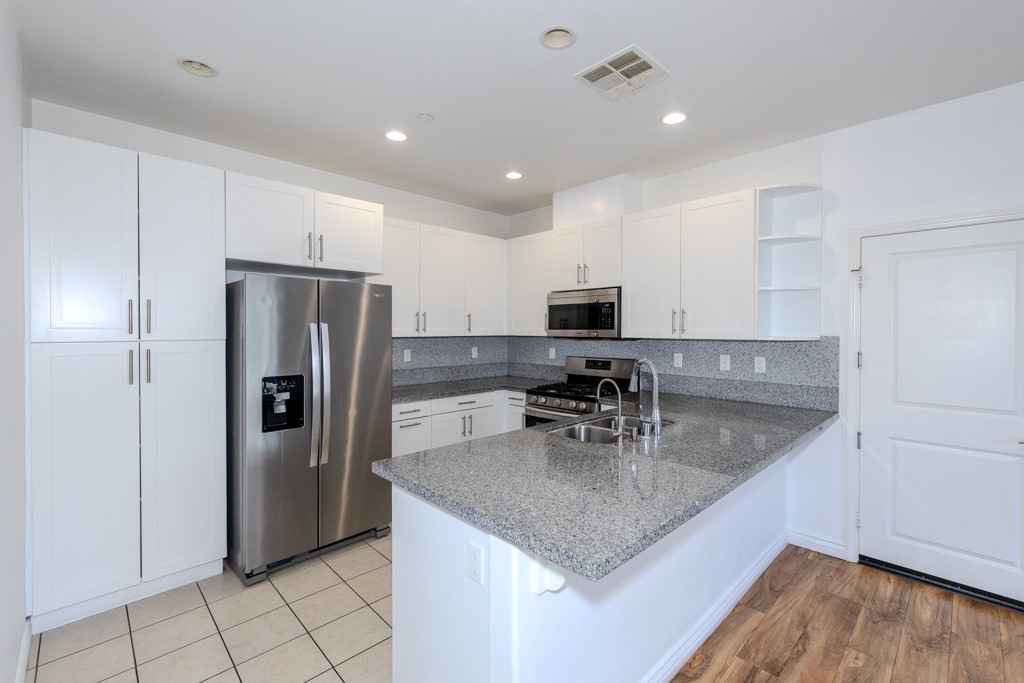 Welcome to this beautifully maintained two-story home offering 4-Bedroom, 3-Bath, 1,609 sq.ft of living space in the desirable Liberty Walk community of Fullerton. Enter through a charming gated front patio that provides a cozy and private outdoor space. The main level features a convenient bedroom and a three-quarter bathroom with granite countertops, ideal for guests. The spacious living and dining areas offer abundant natural light and sliding glass doors that open to the private patio, perfect for relaxing or entertaining. The kitchen features granite countertops, a modern tile backsplash, stainless steel appliances, and recessed lighting. Laminate wood flooring runs throughout the main level. Upstairs, the oversized primary suite includes dual vanities with granite countertops, an oversized soaking tub, a separate shower, and a walk-in closet. Two additional bedrooms share a hall bathroom with granite counters. Additional highlights include solar panels to help lower energy costs, an EV charger in the garage, a first-floor laundry room, and a two-car attached garage with direct access. All utilities are to be paid by the tenant. This desirable corner-lot home is a must-see in the Liberty Walk community.
