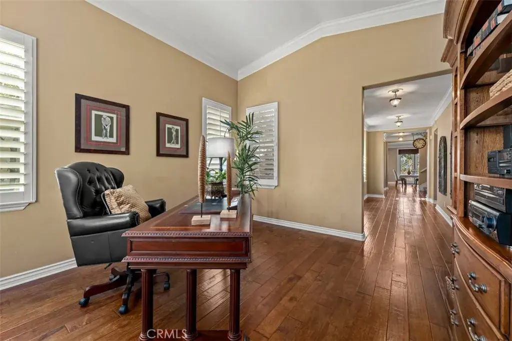 Designed and decorated to impress, this exceptional residence makes an immediate statement from the moment you arrive. A dramatic stacked-stone and wrought-iron entry gate enhances the home’s commanding curb appeal, while interlaced flagstone walkways gracefully frame the façade and set the tone for refined living. A private side courtyard leads to the main entry, where a welcoming hallway unfolds with elegant wood flooring that flows throughout the home. The entry hall splits effortlessly, guiding you to a living room currently styled as a sophisticated executive office, ideal for both productivity and presentation. At the end of the hall, a formal dining room commands attention with custom wine-red walls and an ornate light fixture, creating a striking setting for formal gatherings and memorable dinner events. The open-concept kitchen, anchored by a substantial granite-clad island, seamlessly connects to the family room, offering both function and style. French doors open to a serene backyard retreat that’s simple and low maintenance. The unobstructed mountain views, walking trails, and twinkling city lights provide a breathtaking and tranquil backdrop. The second level reveals a spacious den and a charming hallway ledge that adds architectural interest and visual warmth. Wood shutters line most windows, while custom blinds and drapery introduce accent and flair throughout. Secondary bedrooms, surprisingly spacious are finished with custom textured carpeting, offering comfort and sophistication. The primary suite is a restorative sanctuary fitted with spa-inspired primary bath featuring elegant granite counters, full tiled-wall showers, detailed backsplashes, and a luxurious soaking tub wrapped in a granite slab, promising a quiet and indulgent retreat. Crown molding throughout elevates the home’s executive aesthetic, complemented by curated light fixtures, ceiling fans, toile and sheer curtains that harmonize each space with thoughtful cohesion. Not to miss is a main floor bedroom that hold it’s own elegant setting, finished with custom designer textured carpeting and enhanced with rich color bedding and drapery. A full bathroom on the main level provides convenience, offering an ideal accommodation for guests, multi-generational or extended living needs. All of this is set against spectacular, sweeping views within the exclusive guard-gated community of Hawks Pointe, where privacy, prestige, and refined living converge. Whole house feature PEX piping.