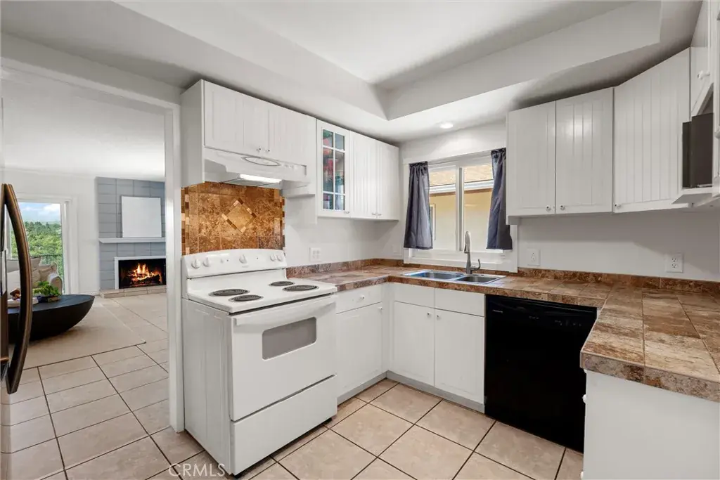 The living room includes tile flooring, a fireplace, and flows into the dining area and kitchen. Other highlights include newer windows throughout, an in-unit laundry room, and two secured subterranean parking spaces.