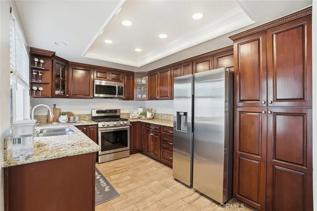 IT COULD BE FEATURED ON THE COVER OF ‘HOME & GARDEN MAGAZINE’! Absolutely stunning residence in the highly desired Coyote Hills “Greens” community. Nestled in the hills and surrounded by lush, mature trees, this home offers a serene and inviting atmosphere. The well-maintained development provides a quiet, relaxing community ambiance, with meticulously cared-for grounds by the HOA. This beautiful end-unit, attached on only one side, features a modern two-story layout designed for today’s lifestyle. With three bedrooms and 2.5 bathrooms, it welcomes you with a double-door entry and a fabulous open-concept floor plan with dramatic cathedral ceilings. The upscale living room is bathed in natural light and offers peaceful greenbelt views from the window. Ceiling fans and upgraded light fixtures enhance comfort and style throughout. The dining area, complete with an upgraded fireplace, is perfect for gathering with family and friends, and a convenient half-bathroom is located downstairs. The gorgeously remodeled kitchen features granite countertops, upgraded cherry wood cabinets, stainless steel and black appliances, a trey ceiling, and tile flooring. Sleek laminate flooring flows throughout the home. The dining/kitchen area opens via sliding door to a spacious covered patio that is fully vinyl-fenced, ideal for pets, BBQs, and outdoor entertaining. Recessed lighting, upgraded fixtures, and dual-pane windows and sliding doors enhance the home’s modern appeal. The impressive master suite boasts a vaulted ceiling, dual sinks, a shower enclosure, and double closet doors. All three bathrooms have been tastefully remodeled with quartz countertops. Direct access to the two-car garage adds convenience, with plenty of guest parking nearby. Enjoy association amenities including a pool, spa, and bike and hiking trails. Award-winning schools include Sunset Elementary, Parks Junior High, and Sonora High. Close to Amerige Heights Shopping Center, grocery markets, restaurants, parks, and golf courses.