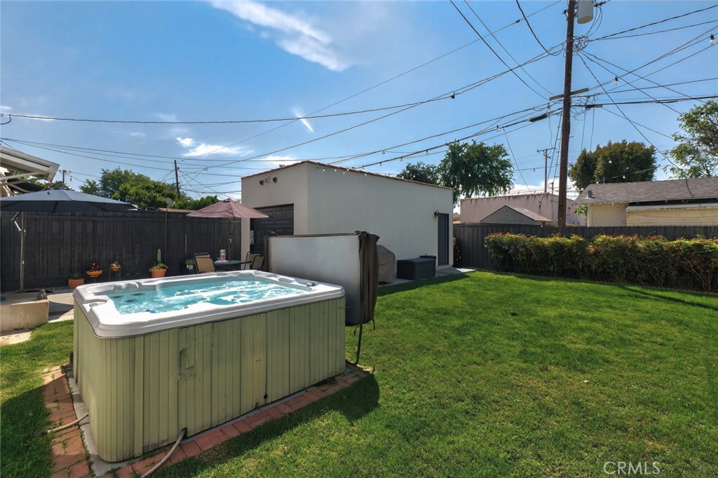 The backyard is designed for both relaxation and recreation, featuring an above-ground spa and a generous open grass yard with plenty of space to unwind, host gatherings, or let kids and dogs play.