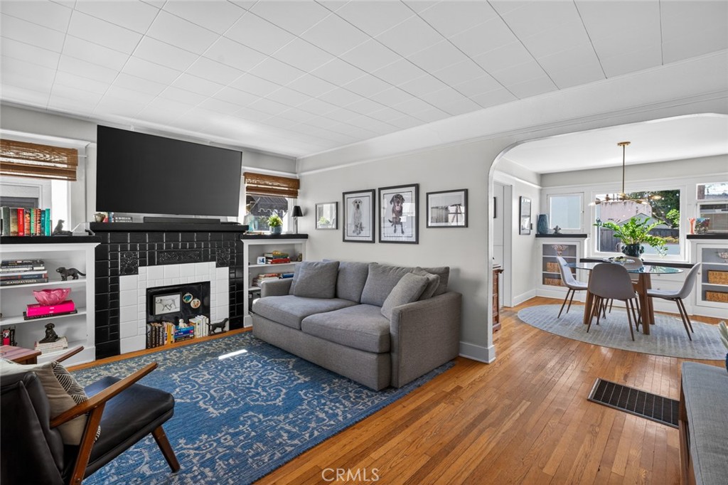 Inside, the 2-bedroom, 1-bath layout (approx. 800 sq ft) feels warm, bright, and thoughtfully connected. Natural light fills the living room, highlighting hardwood floors, a classic fireplace, and charming built-ins—creating a cozy space to unwind or gather with friends. The seamless flow into the dining area makes hosting feel effortless, with an airy ambiance that brings everyone together.