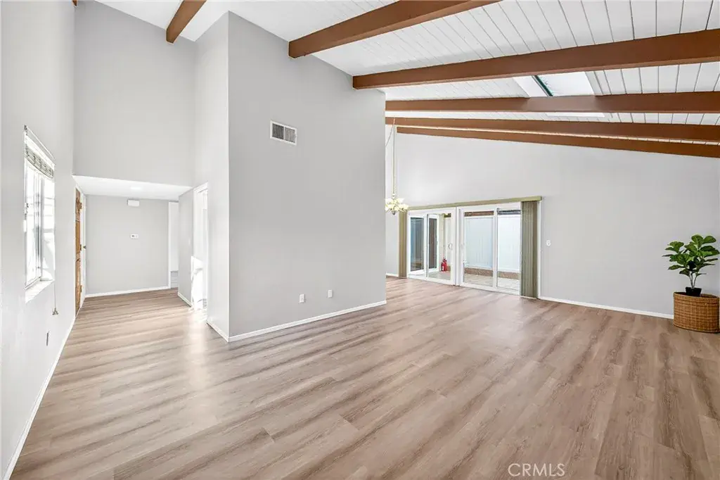 Featuring approximately 1,181 square feet of well-designed living space, this residence includes two spacious bedrooms and two bathrooms with an open, functional floor plan. The light-filled living room showcases vaulted beamed ceilings, a cozy fireplace, and elegant luxury laminate flooring throughout, creating a warm and inviting atmosphere.