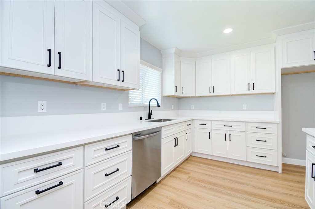 The kitchen has been redesigned and boasts elegant white shaker cabinets, pristine white quartz countertops, and all-new appliances. It is highly functional and offers ample cabinetry for storage, along with a new stove, dishwasher, and microwave.