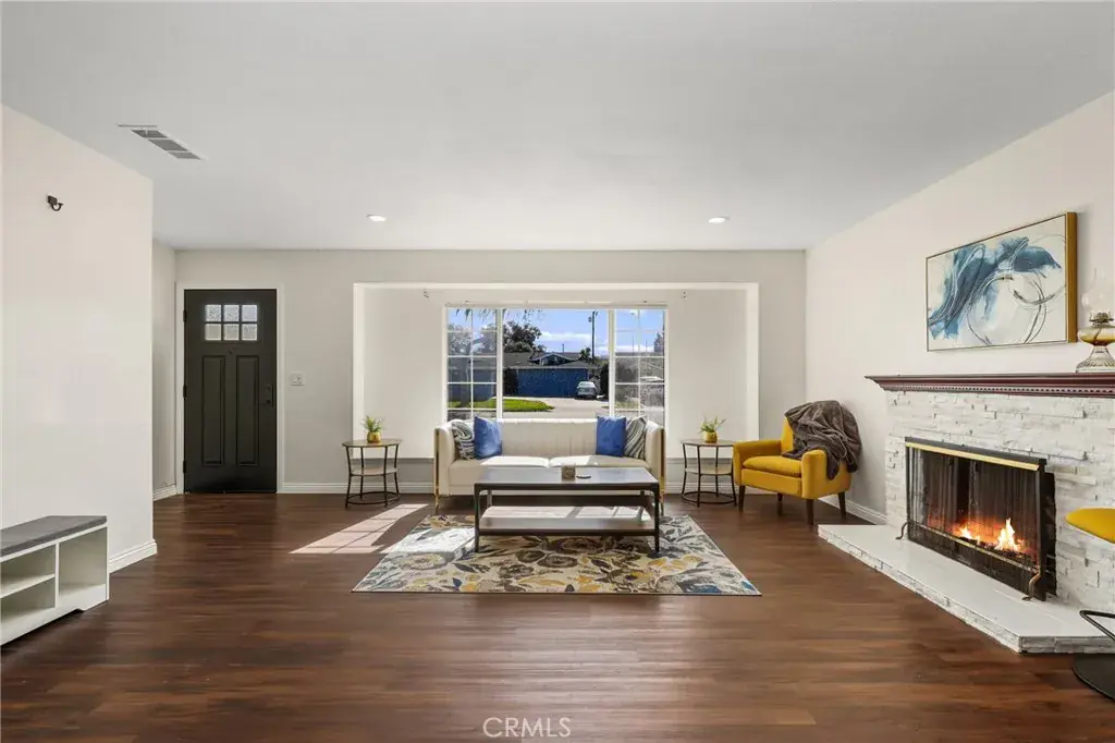 Step inside to a spacious formal living room featuring a cozy fireplace, recessed lighting, and large windows that flood the space with natural light. The remodeled kitchen boasts quartz countertops, stainless steel appliances, and a spice pantry, and opens seamlessly to the dining area—perfect for entertaining. Just beyond, the step-down family room offers direct backyard access through a sliding glass door, creating an ideal indoor-outdoor living experience.