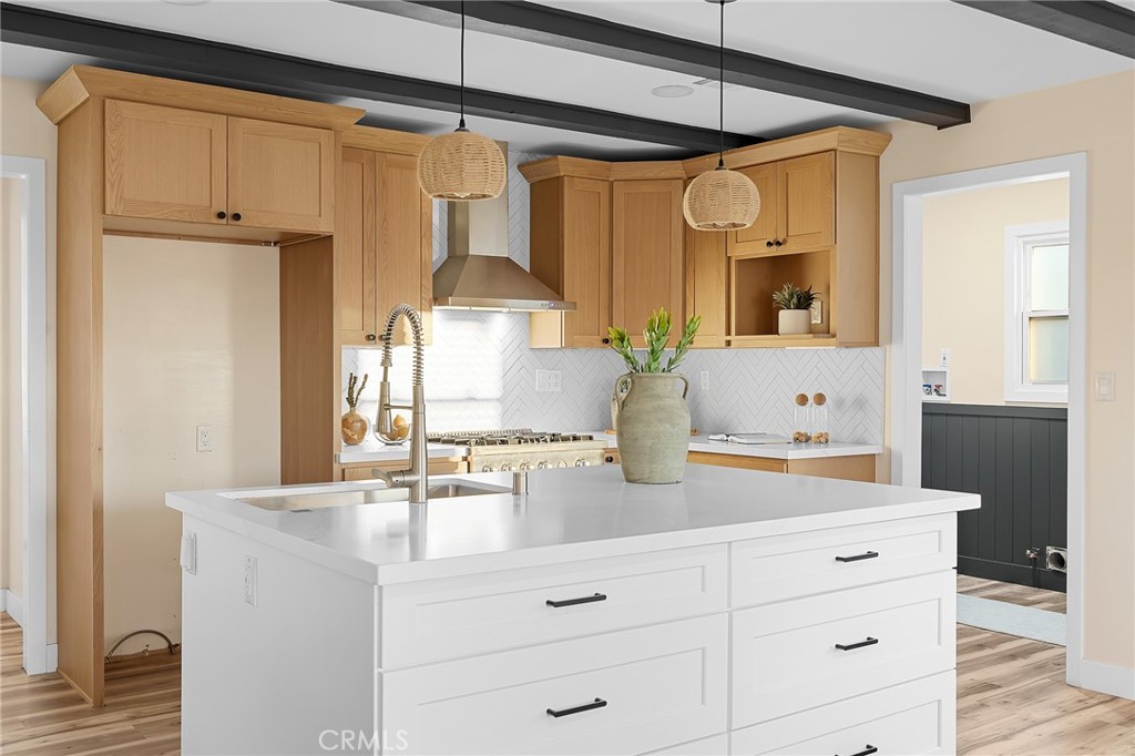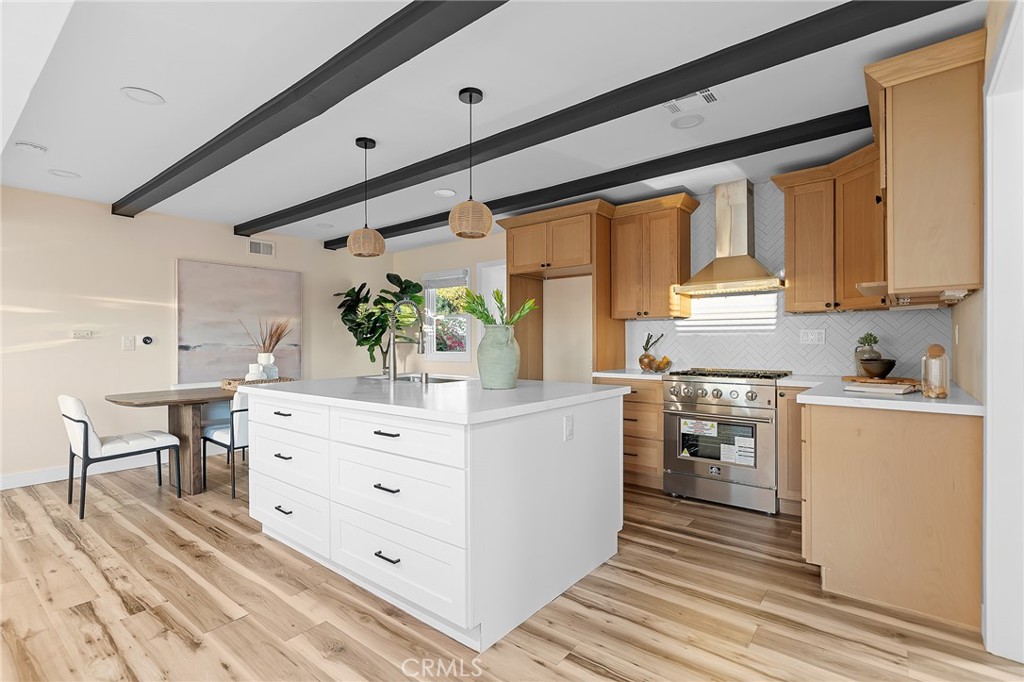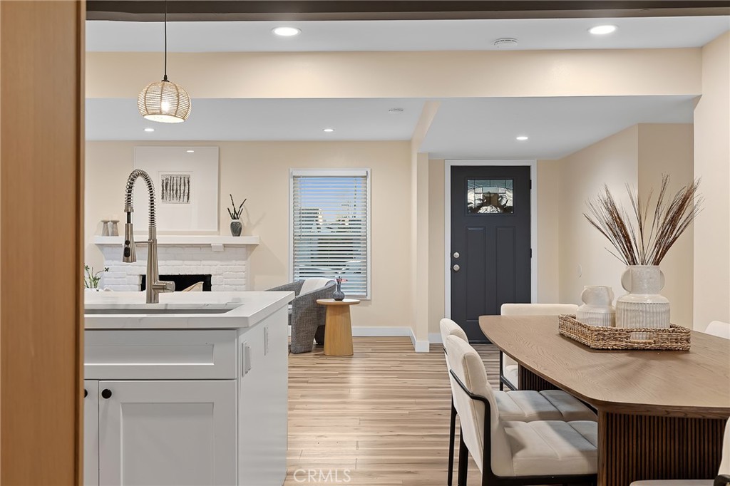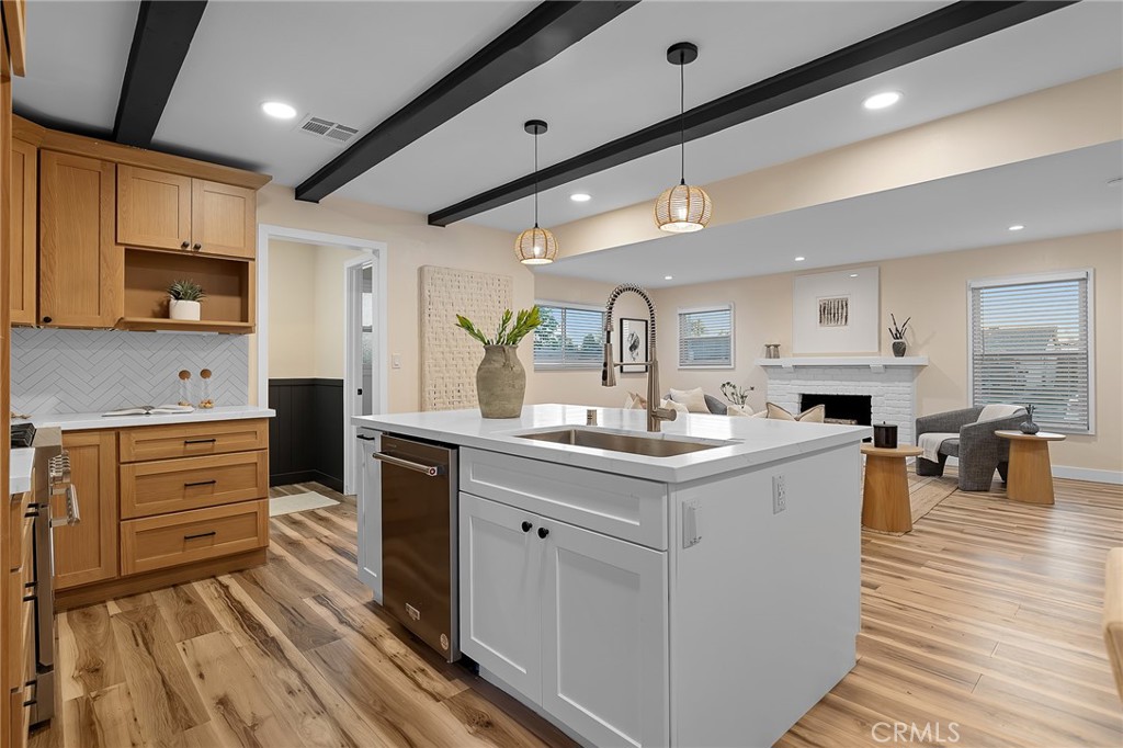 Step inside to a bright, modern open-concept layout anchored by a spacious family room with a cozy fireplace, flowing into the dining area and a stunning new kitchen. The kitchen has been fully upgraded with soft-close cabinetry, quartz countertops, a designer backsplash, hood vent, and a large island featuring pull-out drawers and a built-in spice rack. Enjoy quality appliances including a KitchenAid dishwasher, stainless steel stove, Kohler pull-down faucet, and a deep 32″ sink with disposal.