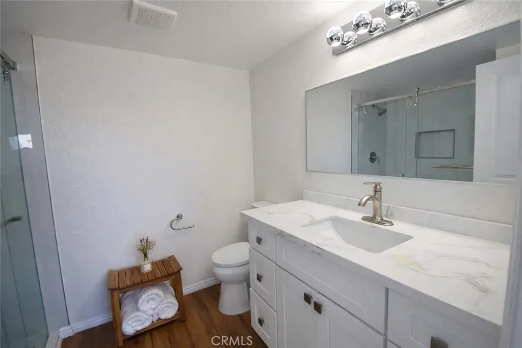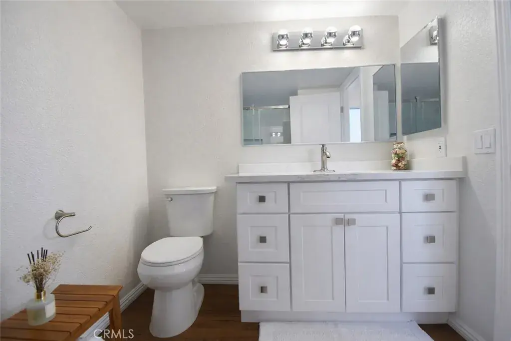 bedrooms with warm wood flooring, including a spacious primary suite offering