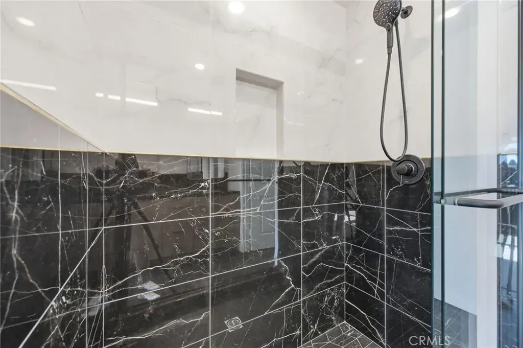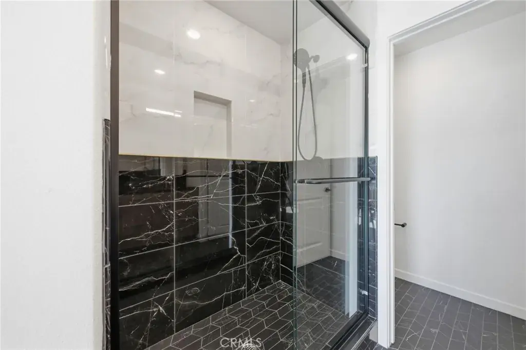 Spa-inspired bathrooms offer floor-to-ceiling designer tile, custom showers, upgraded stone surfaces, framed mirrors, and luxury fixtures, creating a refined and cohesive aesthetic throughout the home.