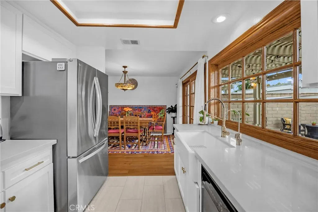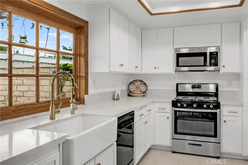 Fabulously upgraded with custom & designer details, this gorgeous townhome is located on a greenbelt in the heart of the highly sought-after gated Valley View Park Townhomes, close to the pool, clubhouse, and with plenty of guest parking. The thoughtful remodel in the last few years begins with dual pane windows, new heating, fresh paint, new carpet, elegant crystal doorknobs and custom wrought iron balusters! The artfully modernized kitchen boasts custom cabinetry with high-end hardware, quartz countertops, a farmhouse sink with pull-down faucet, and a beveled-glass mullioned window overlooking the patio. The inviting living room features plantation shutters, a cozy brick gas fireplace, and serene views of the front brick patio and lush greenbelt. The dining room, with a beveled glass sliding door, creates a seamless indoor-outdoor connection, perfect for entertaining! Stylish finishes continue throughout with oak hardwood floors, elegant gray tiles in the kitchen and baths, and plush herringbone-patterned carpet in the bedrooms. The 3 bathrooms have been beautifully updated, with 2 featuring furniture-quality vanities, new sinks, and modern faucets. Spacious primary suite offers plantation shutters, a wall of mirrored closets, and a private bath with a tiled step-in shower and a newer toilet with bidet feature. Storage is abundant, with large closets, a wall of linen cabinetry, generous kitchen storage, a sizable under-stair space, and built-in shelves and cabinets in the two-car garage. Tech upgrades include Sensi smart thermostat and a Phyn smart water sensor system which will turn off your water supply as soon as it senses a leak! The private, partially covered, brick patio pairs perfectly with the low-maintenance artificial grass, ideal for soaking up CA’s beautiful weather without the hassle of yard work. Valley View Park Townhomes enjoy an intimate community, a pool, spa, and clubhouse, with manicured greenbelts and mature shade trees right outside your door. Just open the windows and enjoy the refreshing coastal breeze that comes most days! Highly rated, award-winning Garden Grove schools, Barker Elementary, Bell Intermediate, and Pacifica HS! Ideally situated near the 22/405/605 freeways, this home offers quick access to CSLB, Sunset/Bolsa Chica beaches, as well as shopping, dining, and entertainment. Even better, Starbucks is only a mile away for your morning coffee run! Experience the perfect blend of style, comfort, and convenience.