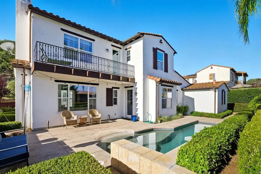 Stunning Eagle Ridge Mediterranean former Shapell model with upgraded options and special landscaping design. It is ideally set across from open space for privacy. Features include hardwood floors, crown molding, custom built-ins, and high-end windows. Gourmet kitchen with large quartz counters, walk-in pantry, and breakfast nook opens to family room with beam ceiling, bay windows, and fireplace. French doors lead to a private courtyard for outdoor dining; backyard offers a sparkling low-maintenance pool. Luxurious primary suite with balcony, spa bath, and custom walk-in closet. Bonus room with built-ins, office, and flexible spaces easily converted to bedrooms. Two gas fireplaces, dual zone for heating and AC, 3-car tandem garage with EV outlet, extra 6 parking spaces available for guests, 32 owned solar panels for minimal utility costs. Located in gated Eagle Ridge with Clubhouse, Pool, Basketball ball court , Tennis courts, Bocce Ball, Organized activities, Parks, Walking Trails, and low HOA fees.