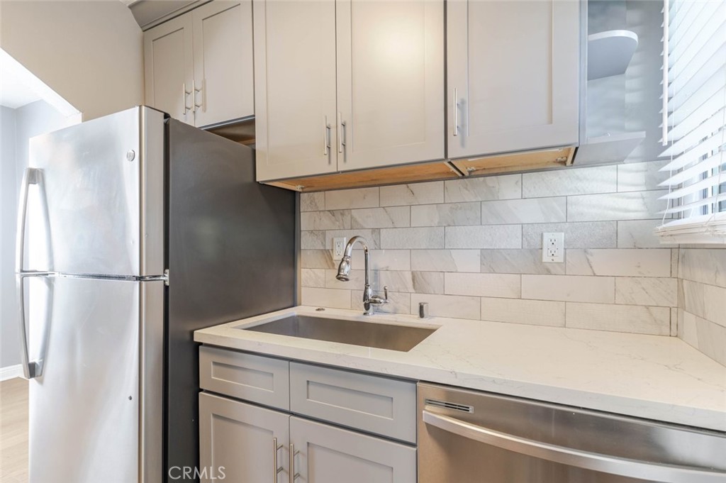 The modern kitchen is equipped with stainless steel appliances, including a stove, refrigerator, microwave, and dishwasher, complemented by a sleek backsplash that adds a contemporary touch. Both the living room and bedroom are equipped with A/C and heating, ensuring year-round comfort.