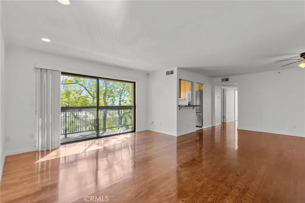 The entry opens into a spacious living area that extends to a private balcony overlooking a tree-lined street — an ideal place to unwind or enjoy some fresh air. The kitchen offers ample cabinet space, solid countertops, and essential stainless steel appliances, with a dining area nearby for everyday meals or casual gatherings.