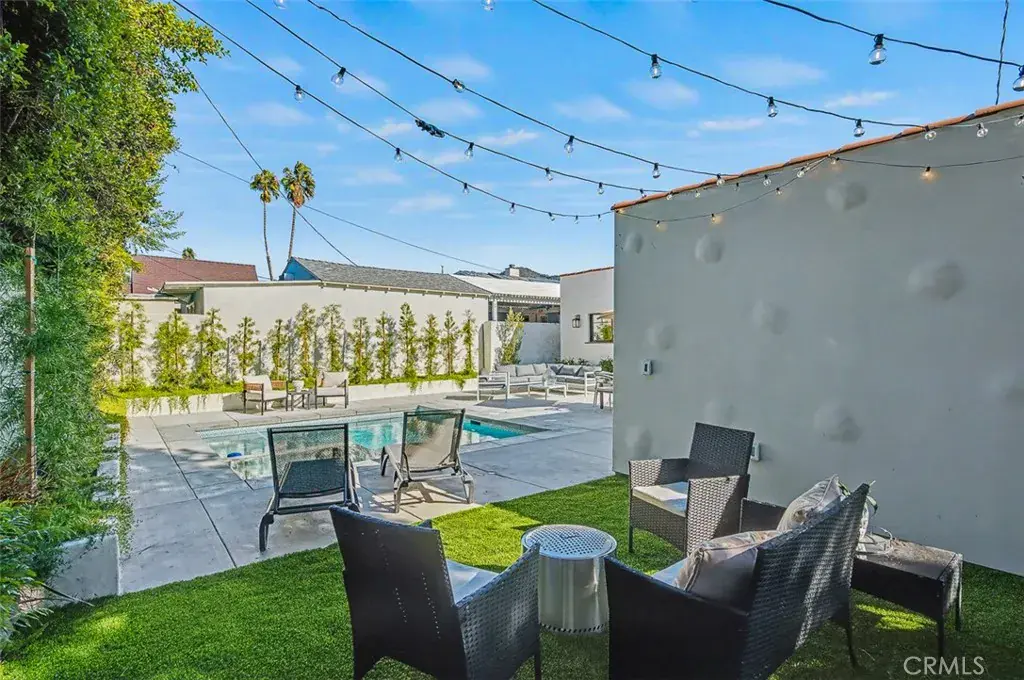 The private backyard offers a reconfigured pool and spa, refreshed landscaping, outdoor dining and lounge areas, privacy hedging, and a resurfaced long driveway.