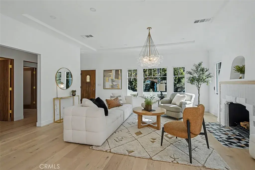 Bright interiors showcase vaulted ceilings, wide-plank engineered hardwood floors, custom wood doors, elegant millwork, and a preserved original fireplace anchoring the main living area. The custom chef’s kitchen features a premium appliance suite, stone waterfall island with seating, custom cabinetry, and seamless indoor-outdoor flow.
