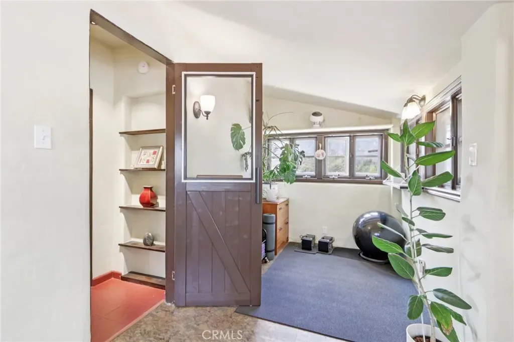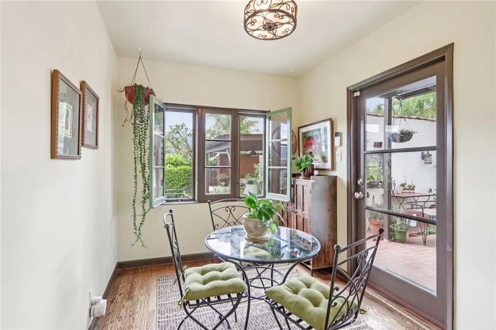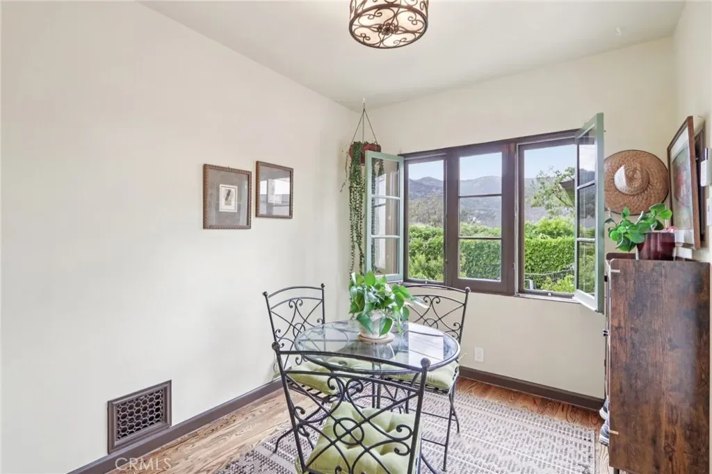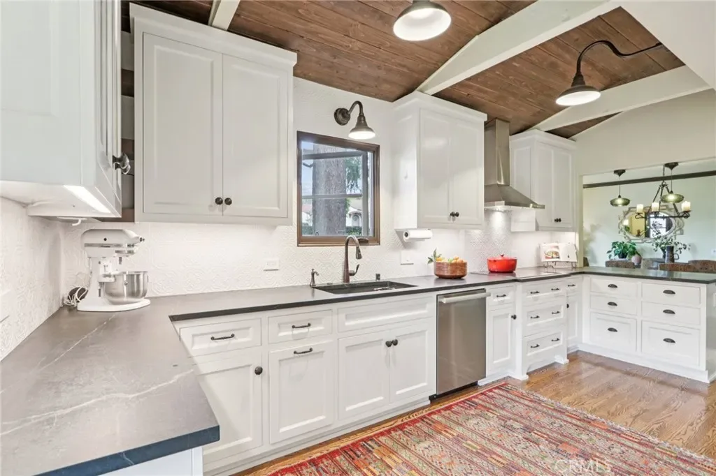 The living room sets the tone with beautiful beamed ceilings and a fireplace that anchors the space with undeniable charm. Just beyond, the dining room offers built-in nooks and cabinetry that feel equal parts practical and storybook—perfect for hosting lively dinners or slow Sunday brunch.
