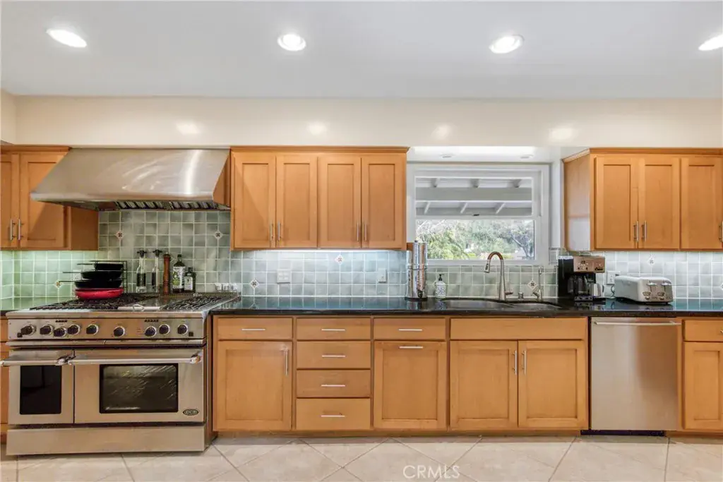 The home features a spacious living room with classic built-ins, a fireplace, and French doors that open to an inviting patio—ideal for seamless indoor-outdoor living and entertaining. Beautiful wood floors run throughout, and the interior has been recently painted, creating a bright and refreshed feel. The updated galley-style kitchen is equipped with a chef’s stove, ample cabinetry, and a charming breakfast nook, making it both functional and welcoming, providing a cozy space for casual meals.