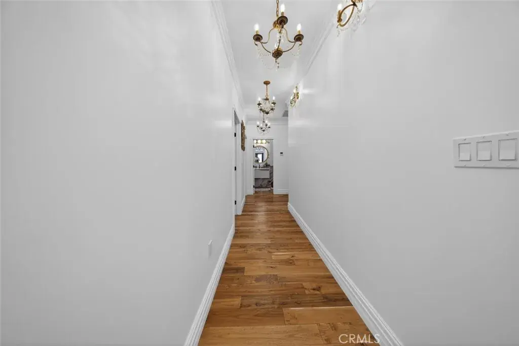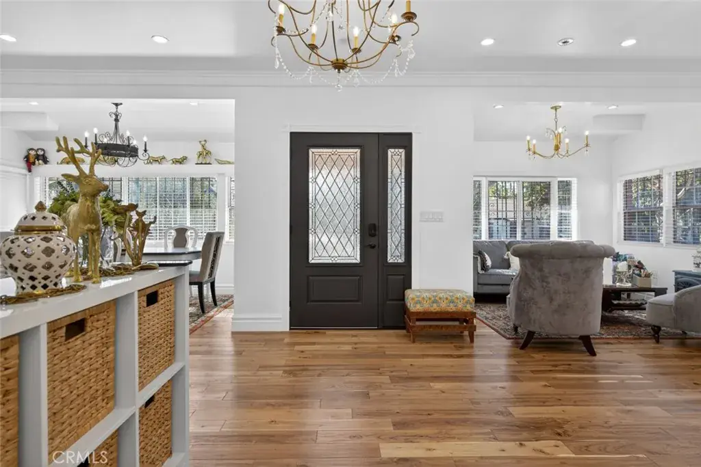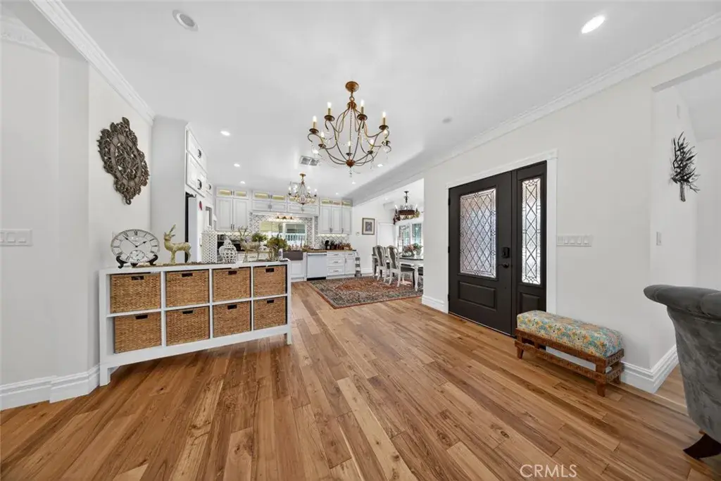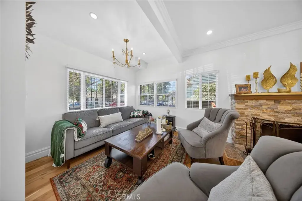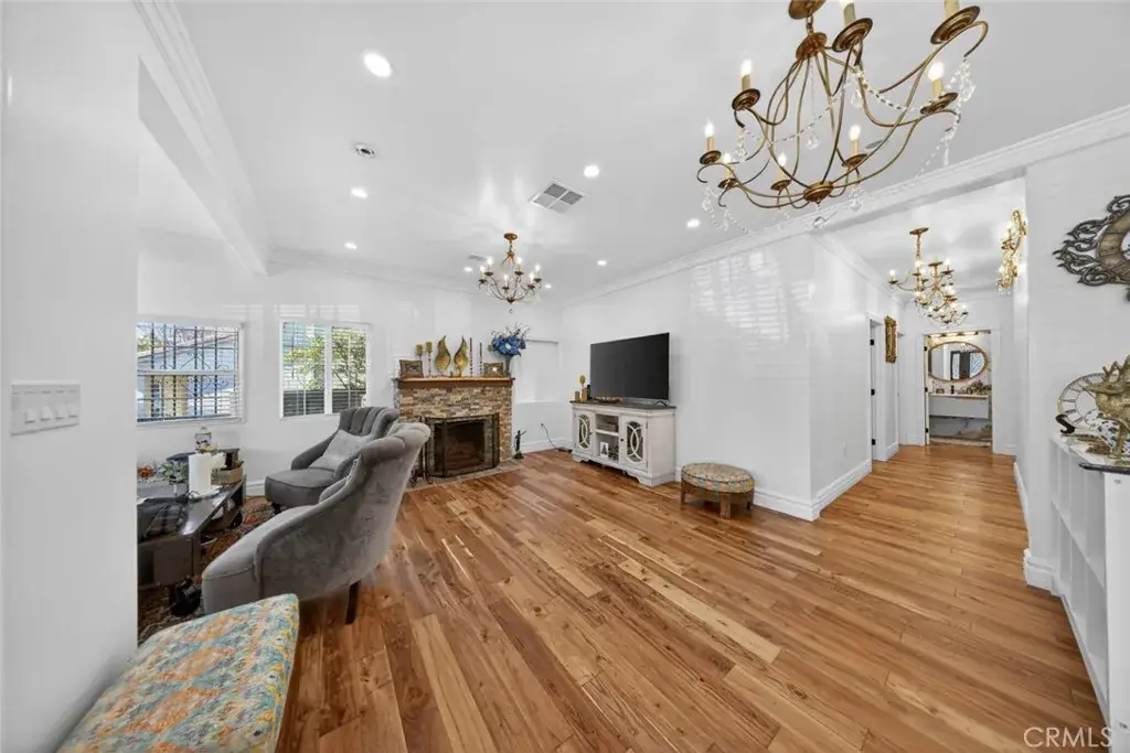 Inside, warm wood flooring flows through the main living areas, complemented by recessed lighting, crown molding details, and abundant natural light. The spacious living room features a fireplace and built in cabinetry, creating a comfortable setting for everyday living and gatherings.