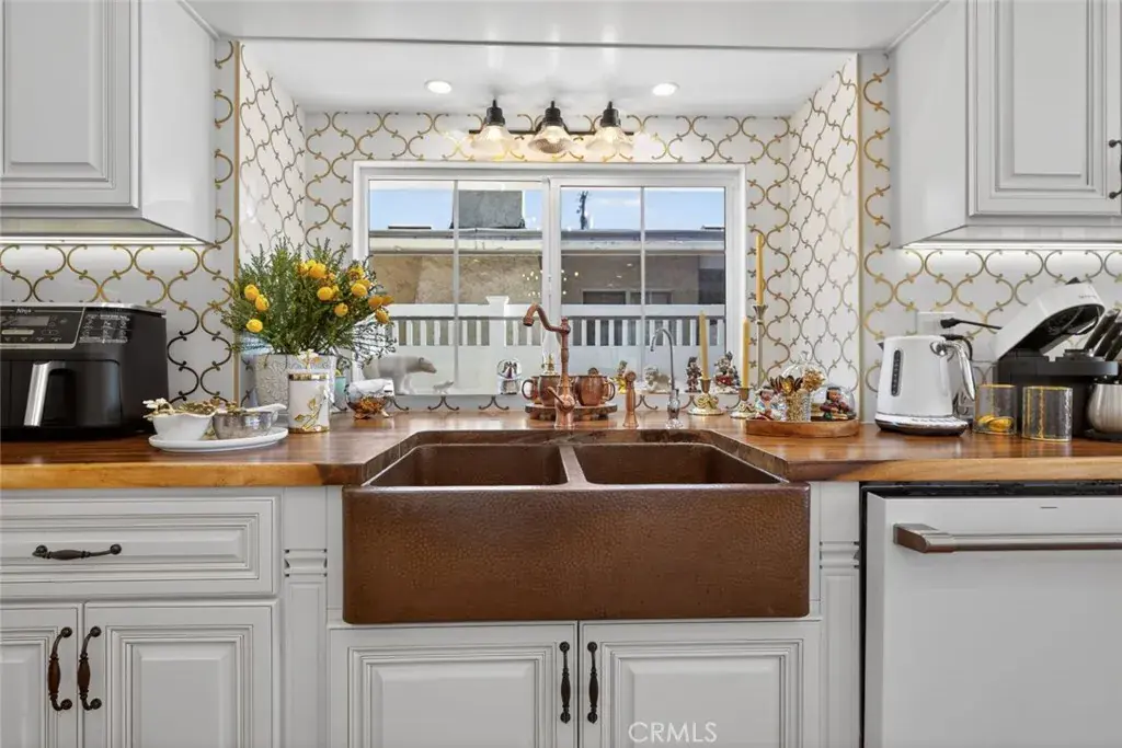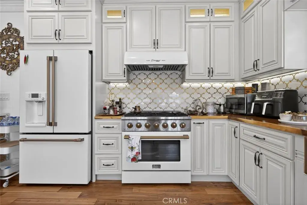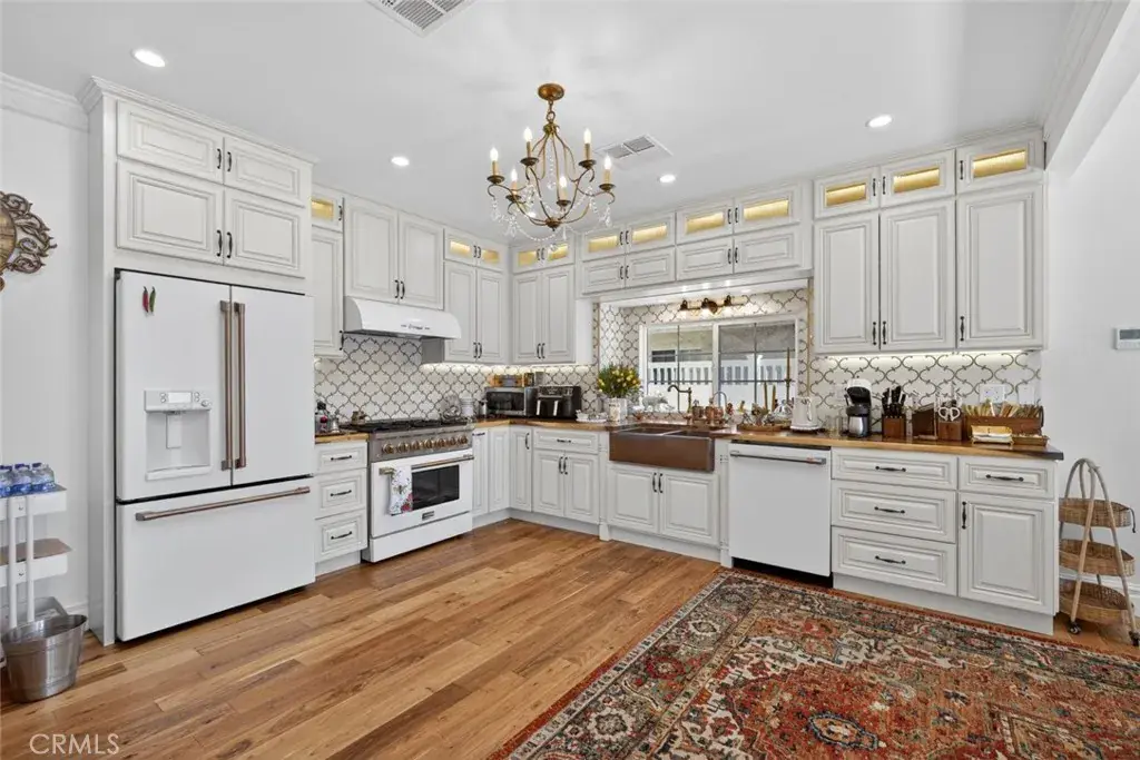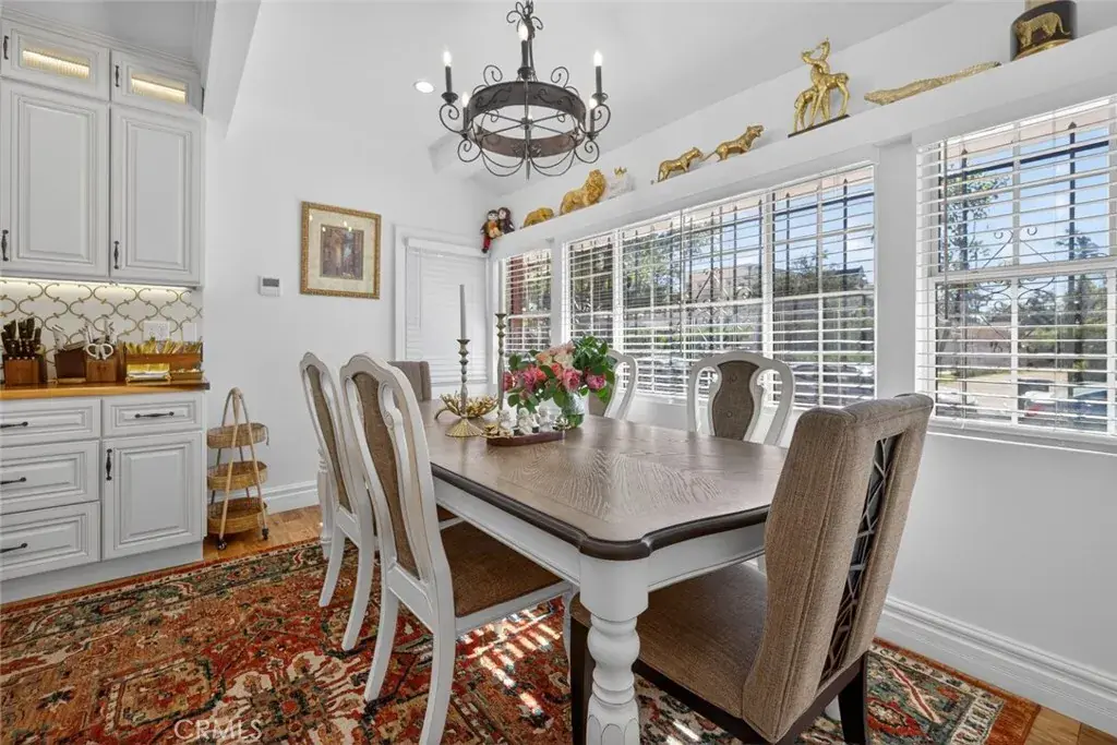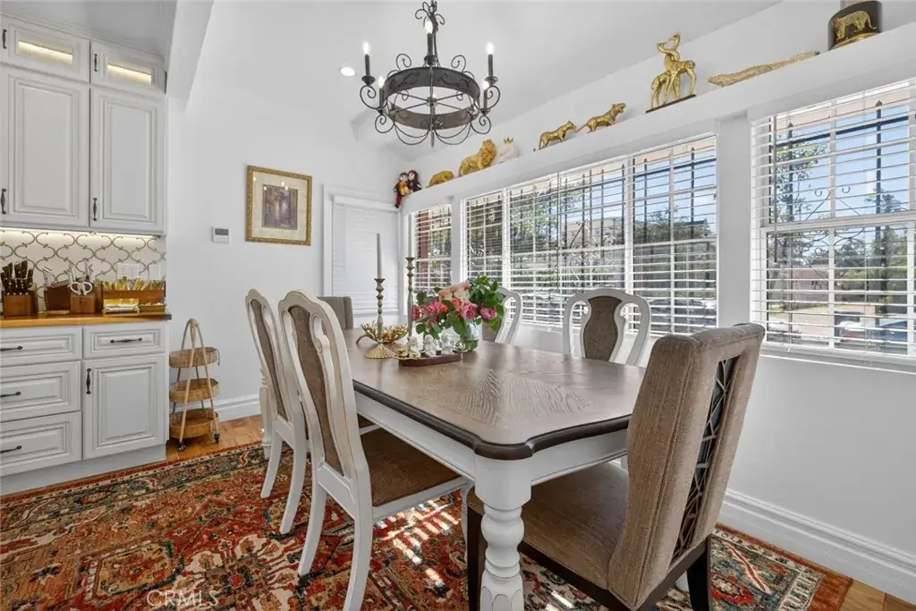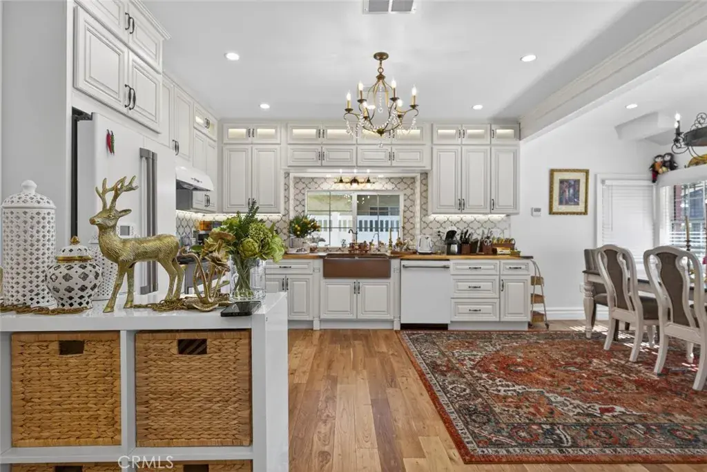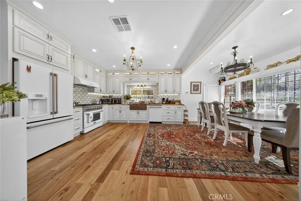 The kitchen is thoughtfully designed with white cabinetry, stone countertops, stainless steel appliances, decorative tile backsplash, and generous storage space. Adjacent dining and seating areas provide flexibility for both casual meals and entertaining.