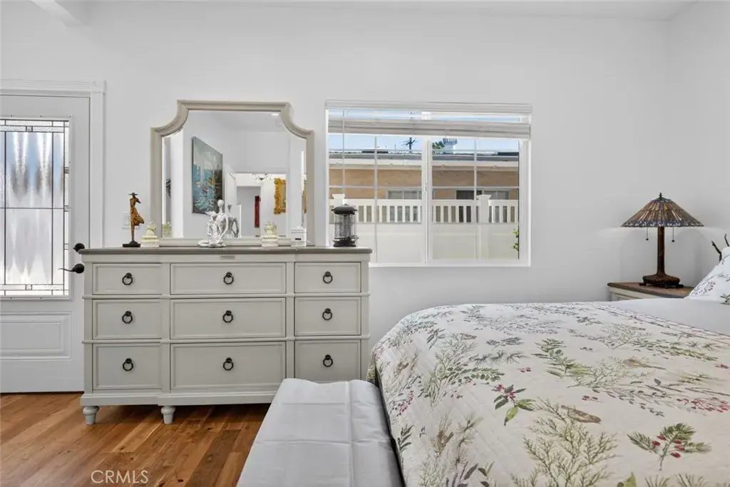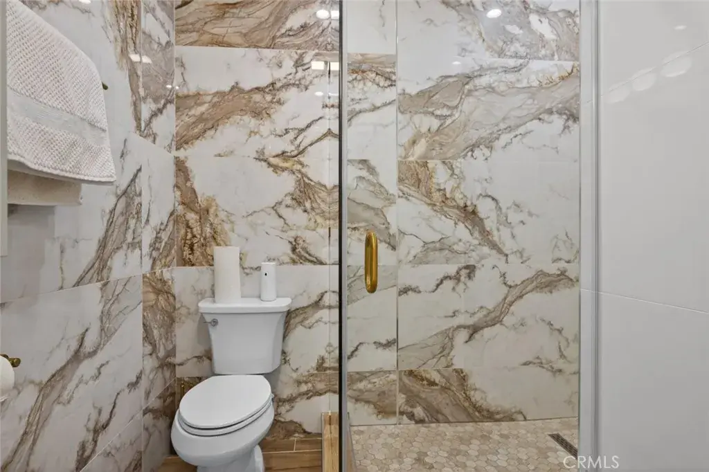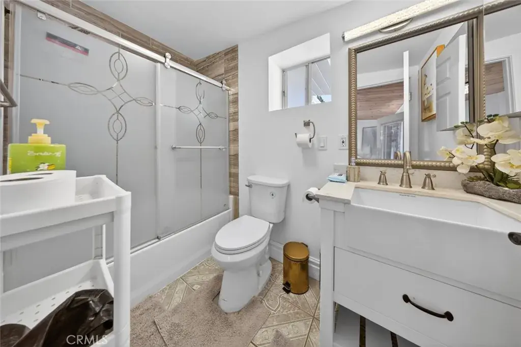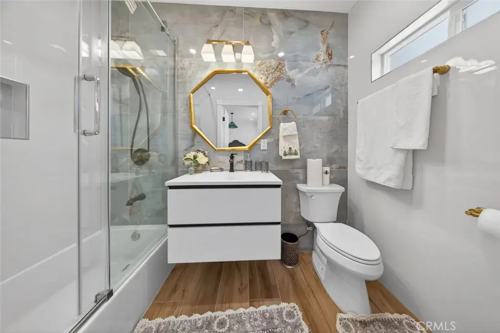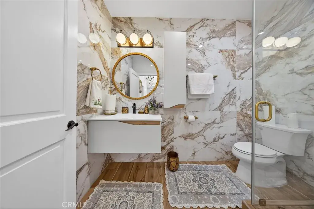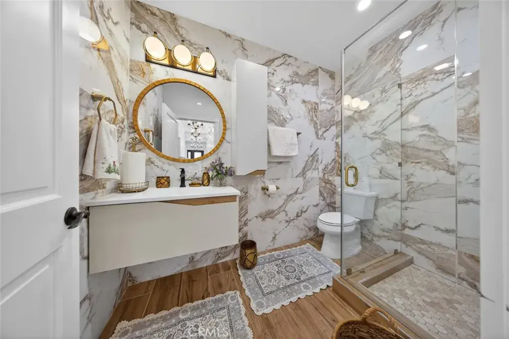 Both bathrooms have been updated with modern finishes including custom vanities, framed mirrors, and tiled shower enclosures. The bedrooms offer comfortable layouts, ample closet space, and continued natural light.