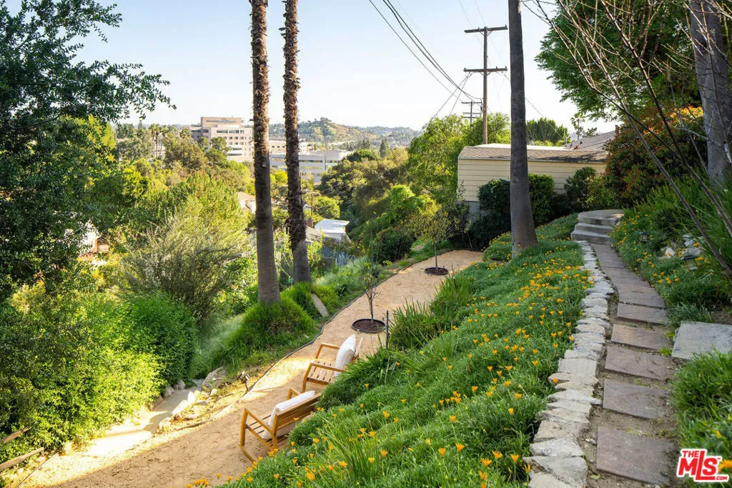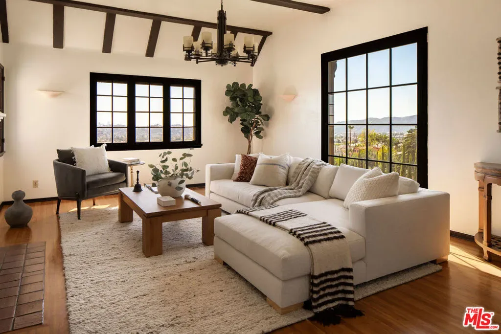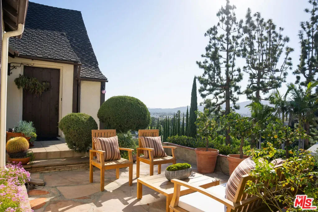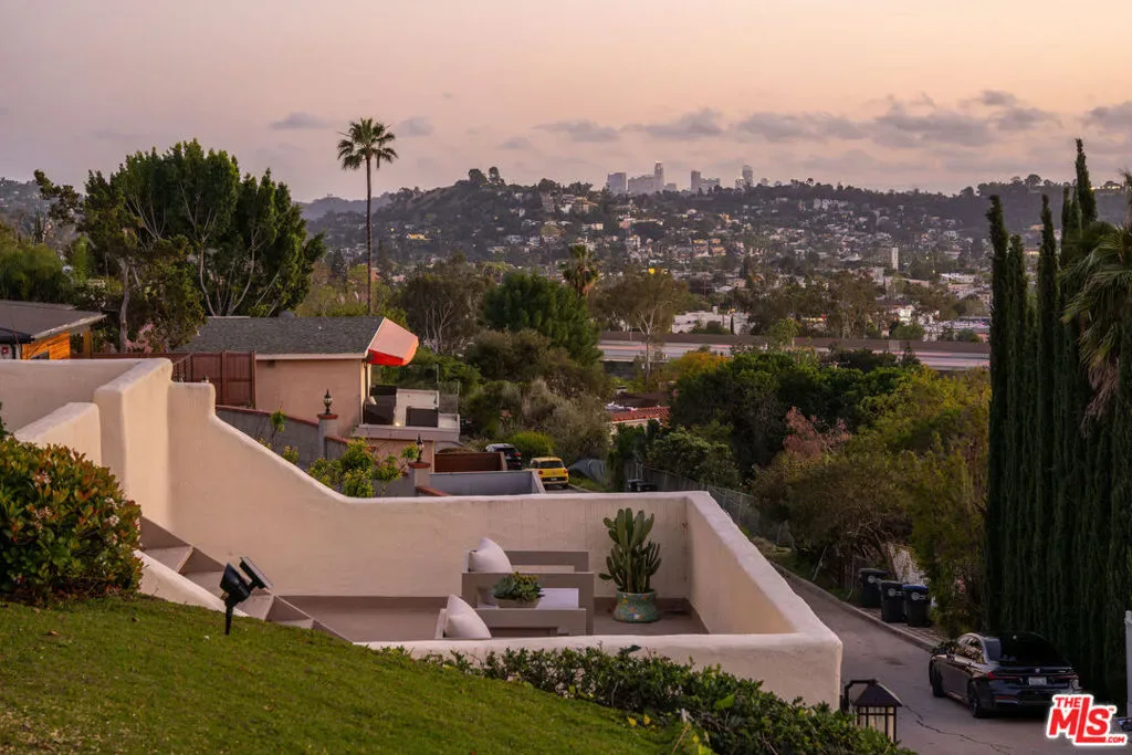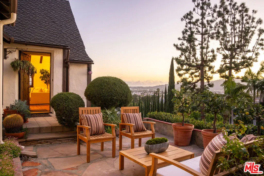 Perched on a private hillside in Glendale’s coveted Chevy Chase Canyon, this timeless Tudor Revival captures sweeping 270-degree views stretching from the canyon below to the Downtown Los Angeles skyline and all the way to the Pacific Ocean. The elevated setting offers exceptional privacy and a breathtaking panorama of rolling hills, sparkling city lights, and distant coastal horizons. Rich in architectural character and enduring craftsmanship, the residence offers four bedrooms and three bathrooms across a gracious floor plan defined by traditional Tudor details. Warm hardwood floors, arched passageways, and original detailing create an atmosphere of timeless elegance throughout. At the heart of the home, the living room is both dramatic and inviting, with exposed ceiling beams, a statement fireplace, and expansive picture windows framing the surrounding hills and Downtown LA skyline. Flooded with natural light by day and glowing with city lights at night, it provides a beautiful setting for both quiet evenings and entertaining. Through graceful arched openings, the formal dining room sits between the living room and kitchen, creating a natural flow for gatherings. The kitchen blends warmth and functionality with custom wood cabinetry, stone countertops, stainless steel appliances, and generous storage, while a sunlit breakfast area provides a welcoming spot for casual meals or morning coffee. The home’s bedrooms are thoughtfully arranged for comfort and privacy. The primary suite occupies the entire second floor, creating a true retreat with vaulted ceilings and a dramatic arched window framing DTLA skyline views. Generous in scale, the suite offers space for both sleeping and sitting areas, while the adjoining bath features a Japanese-style soaking tub, a brand-new walk-in shower, and distinctive geometric windows that bring in soft natural light. Additional bedrooms on the main level are well-proportioned and versatile, served by two bathrooms including a charming hallway bath with vibrant vintage turquoise tile and an additional en-suite bath. Outdoor spaces further enhance the home’s sense of retreat. At the front of the home, a flagstone patio offers a picturesque setting for al fresco dining beneath mature trees and cafe lights. Above the garage, a private terrace provides another inviting seating area and a perfect perch for canyon and city views. Behind the home, terraced hillside gardens unfold with winding paths and multiple seating areas overlooking the surrounding landscape. The property spans street-to-street, ensuring no neighbors directly behind and enhancing the sense of privacy. Set within one of Glendale’s most picturesque hillside neighborhoods, this exceptional property offers a rare combination of architectural character, breathtaking views, and tranquil outdoor living.