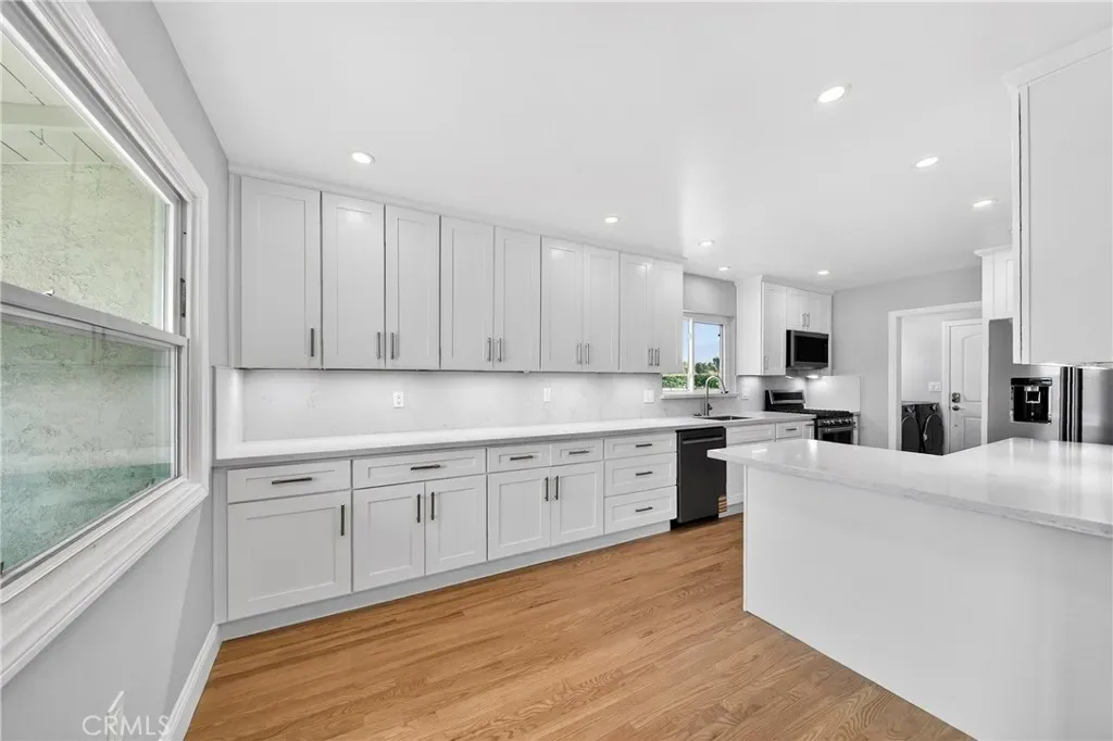 The remodeled modern kitchen features custom cabinets, quartz countertops with full backsplash, stainless steel appliances, under-cabinet lighting, and opens to the dining area. A complete appliance package is included: range/oven, microwave, dishwasher, refrigerator, washer, and dryer.