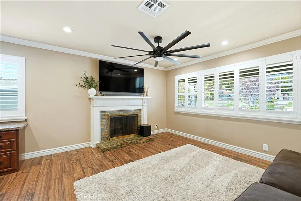 This single-story residence is located in the foothills of Glendora and near the San Gabriel Mountains. The home offers an open floor plan with defined living and dining areas. The remodeled kitchen features granite countertops, a center island with seating, a garden window, and extensive cabinetry for storage and workspace. Wood-look flooring runs through the main living areas, complemented by recessed lighting and crown molding. The living room includes a fireplace and open sightlines to the kitchen, supporting everyday living and entertaining. Three main-level bedrooms each feature carpeted flooring, plantation shutters, crown molding, and recessed lighting. One bedroom includes an oversized closet and French door access to the backyard. A full hall bathroom offers a granite vanity, tub/shower combination with glass enclosure, tile flooring, and a window for natural light. A separate half bathroom adds convenience. A dedicated indoor laundry room includes upper and lower cabinetry, countertop workspace, and direct access to the backyard. Outdoor areas include a covered rear patio with ceiling fan, concrete hardscape, artificial turf lawn, storage shed, and an enclosed perimeter yard. The detached two-car garage is accessed by a long driveway extending from the rear of the property, in addition to a horseshoe driveway at the front. A covered front porch and landscaped front yard complete the exterior. The property is located near parks, shopping, dining, and major roadways, offering convenient access to Glendora Village and surrounding San Gabriel Valley destinations.