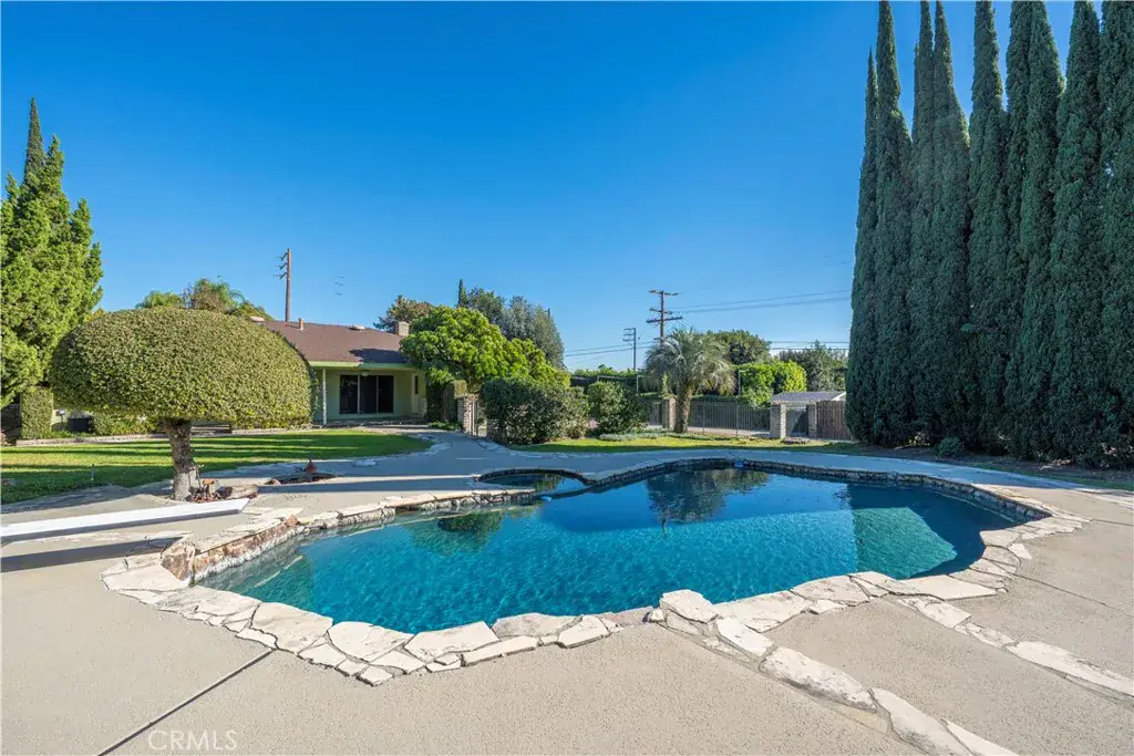 This single-story residence is situated on an expansive lot in a Glendora neighborhood near the foothills and offers a functional floor plan with generous indoor and outdoor living spaces. The home features approximately 2,160 square feet of living space with four bedrooms and three bathrooms, including a primary suite with a three-quarter bathroom and dual-sink vanity. A spacious living room with fireplace provides a comfortable gathering area, while the adjacent dining and family areas connect seamlessly to the kitchen. The kitchen includes ample cabinetry, counter space, and a breakfast nook, with direct access to the backyard. Additional interior features include central air conditioning, multiple sliding doors and windows for natural light, and an attached two-car garage with a long driveway providing additional parking. The backyard is designed for both everyday use and entertaining, highlighted by a pool and spa surrounded by curved concrete decking and natural stone accents. Multiple patio areas, a covered patio, lawn space, mature landscaping, and winding walkways create a private, park-like setting. A gazebo-style structure and expansive yard offer flexibility for outdoor dining, recreation, and gatherings.