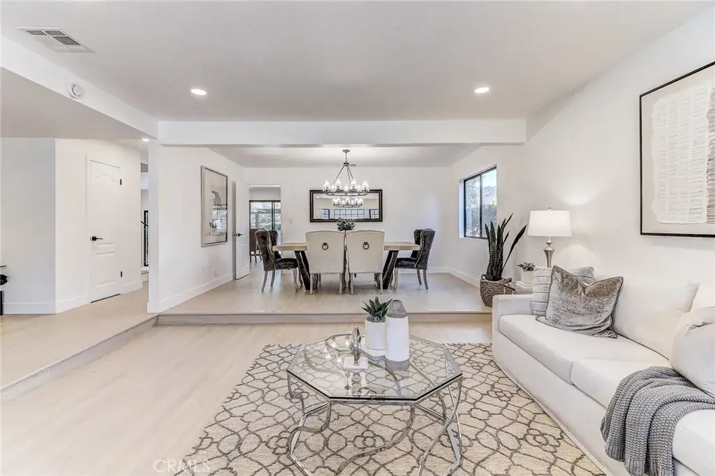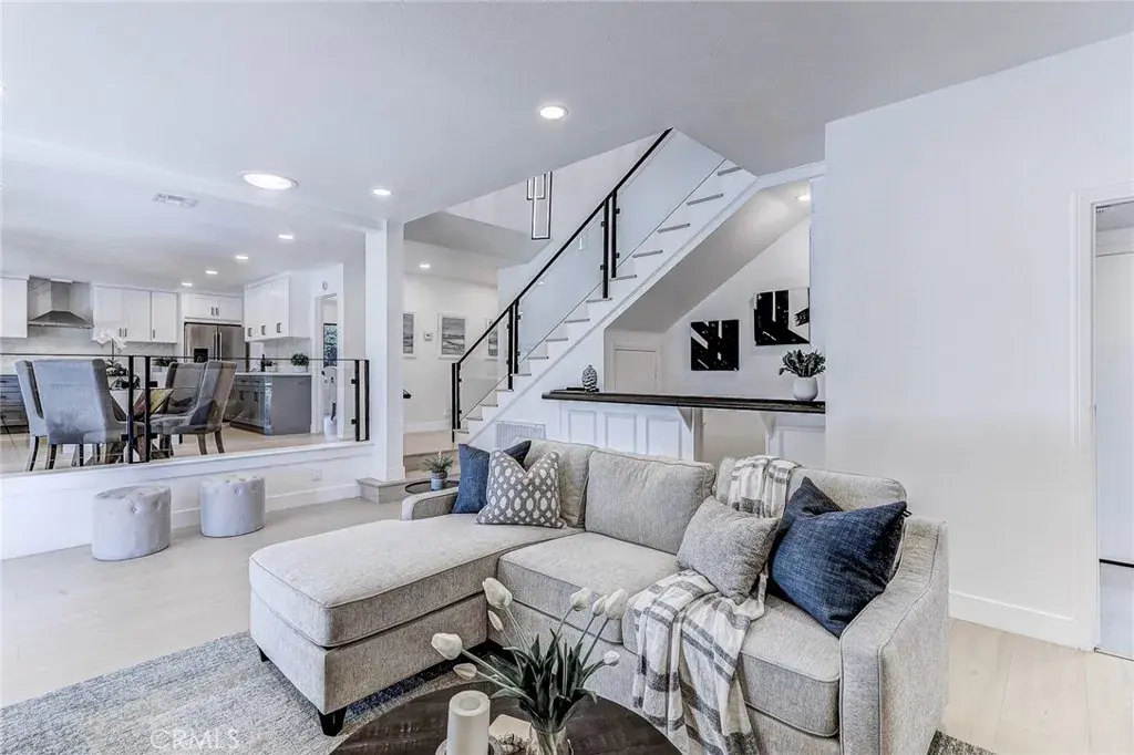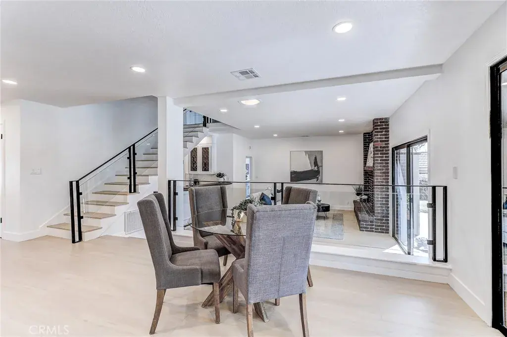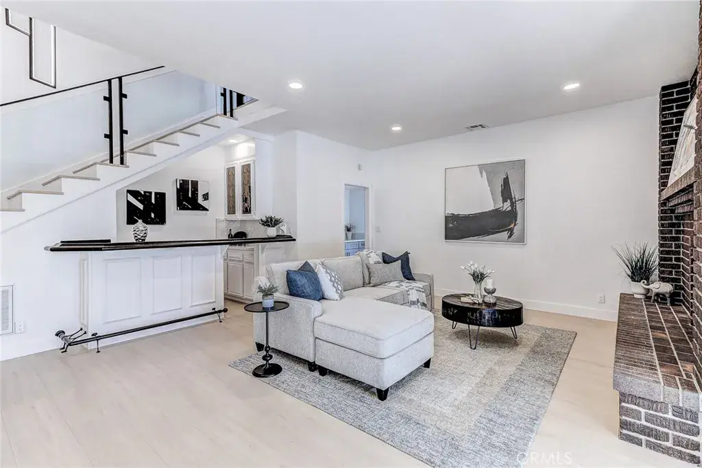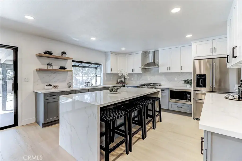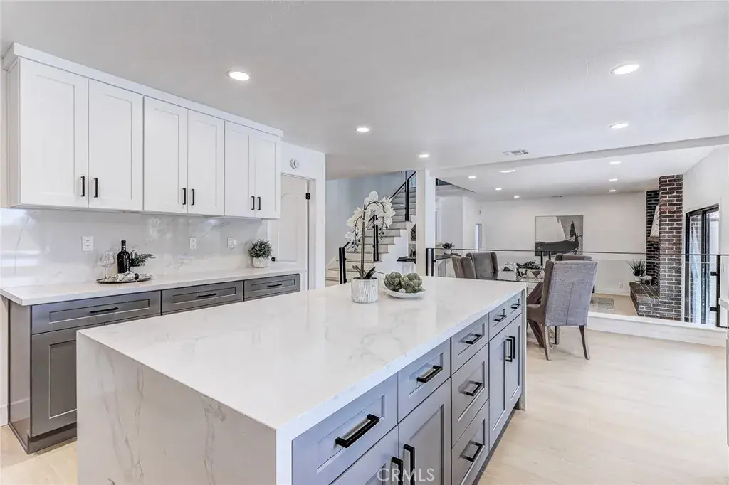 Inside, upgraded wide-plank flooring and soft recessed lighting create a warm yet contemporary ambiance throughout. The thoughtfully designed formal living and dining spaces include a step-down living room adorned with a charming bay window—an inviting setting for intimate gatherings and refined entertaining. At the heart of the home lies a spectacular, fully remodeled chef’s kitchen featuring gleaming quartz countertops, brand-new stainless-steel appliances, custom cabinetry, and a dramatic waterfall island with seating for four. The adjoining breakfast nook overlooks the family room through a sleek glass balustrade and opens seamlessly to the backyard, creating a natural flow between indoor comfort and outdoor leisure.