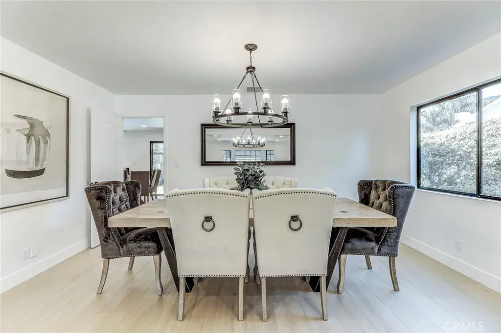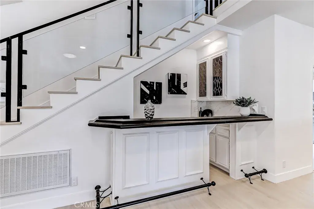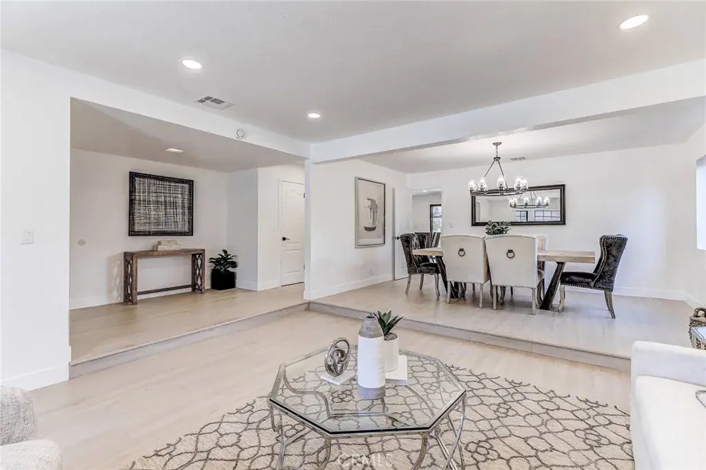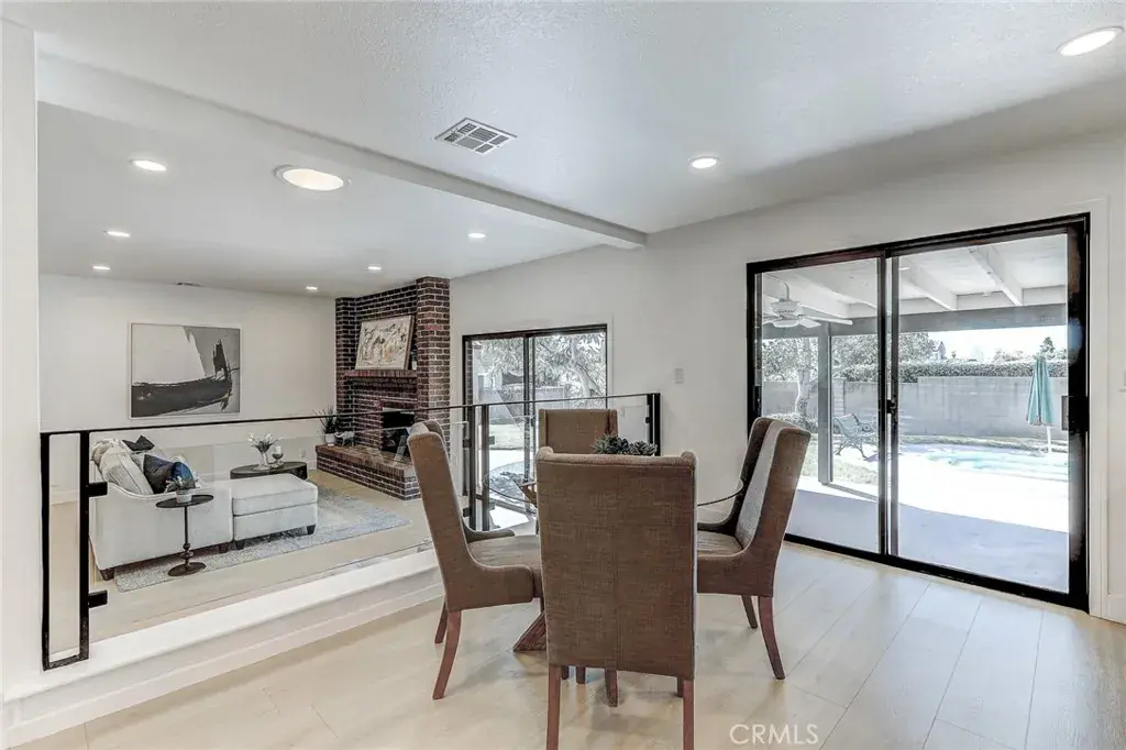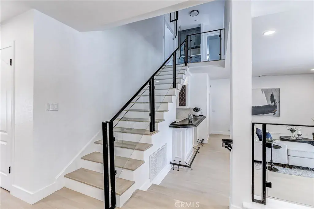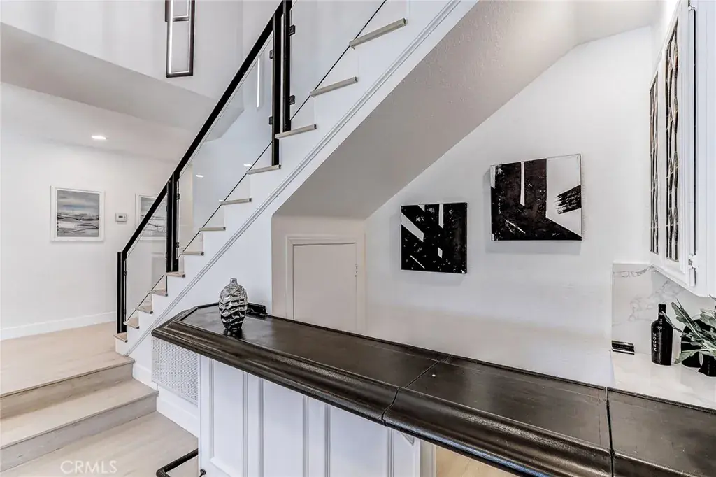 Inside, upgraded wide-plank flooring and soft recessed lighting create a warm yet contemporary ambiance throughout. The thoughtfully designed formal living and dining spaces include a step-down living room adorned with a charming bay window—an inviting setting for intimate gatherings and refined entertaining. At the heart of the home lies a spectacular, fully remodeled chef’s kitchen featuring gleaming quartz countertops, brand-new stainless-steel appliances, custom cabinetry, and a dramatic waterfall island with seating for four. The adjoining breakfast nook overlooks the family room through a sleek glass balustrade and opens seamlessly to the backyard, creating a natural flow between indoor comfort and outdoor leisure.