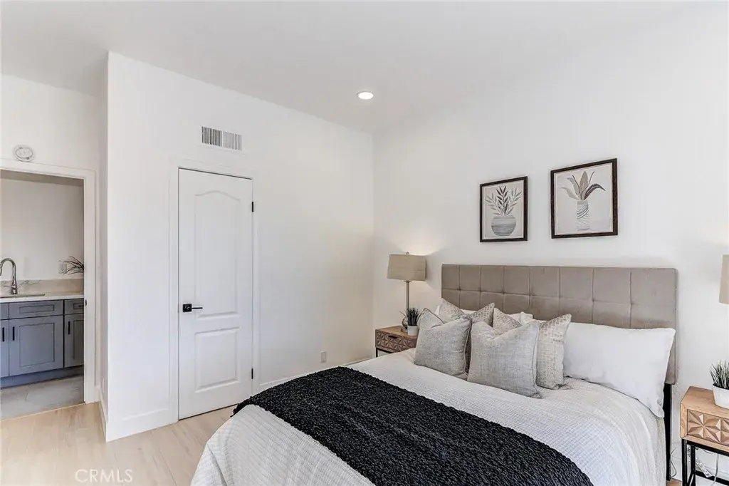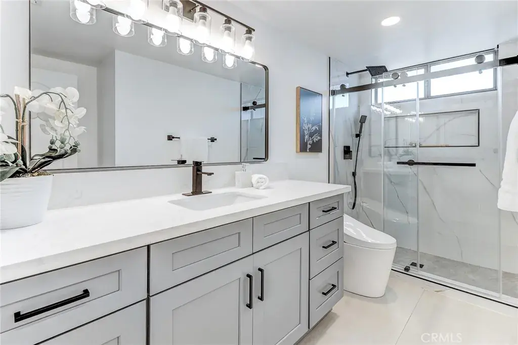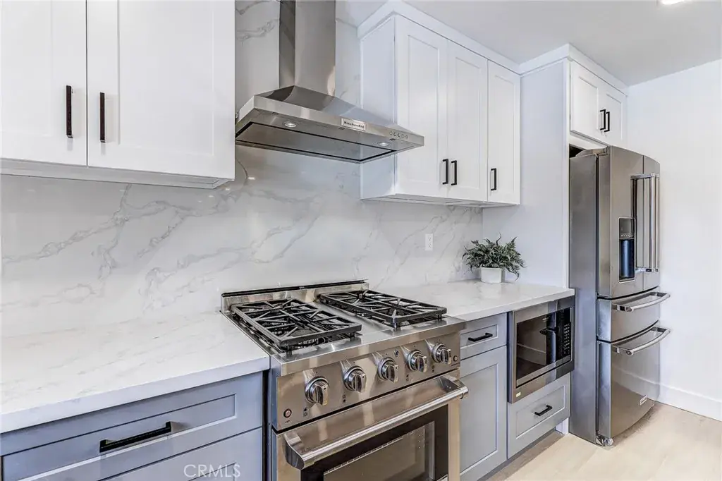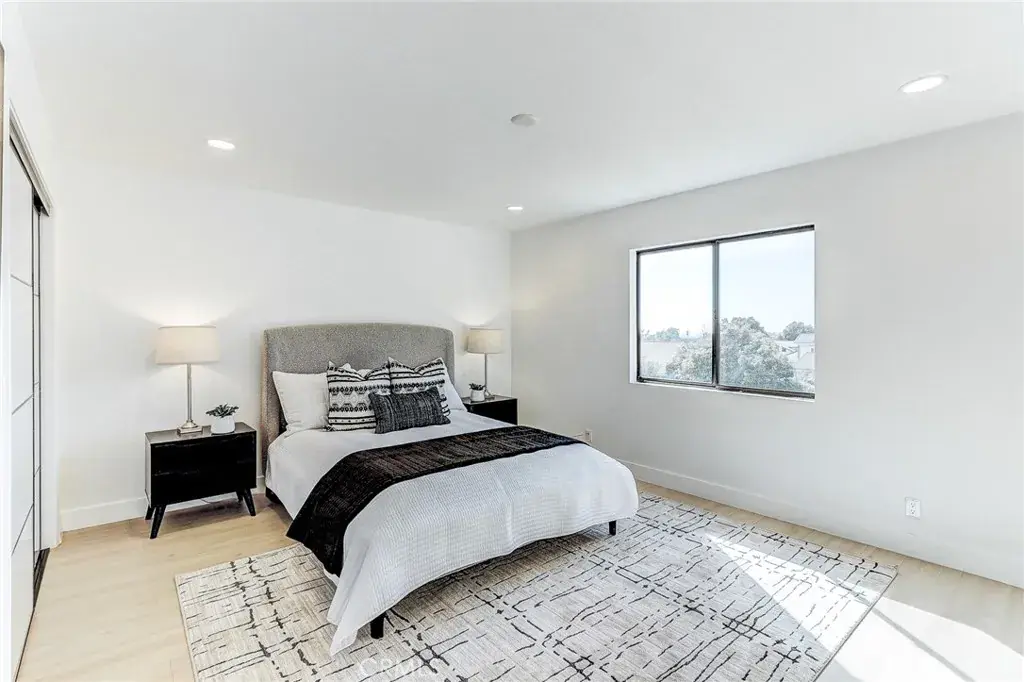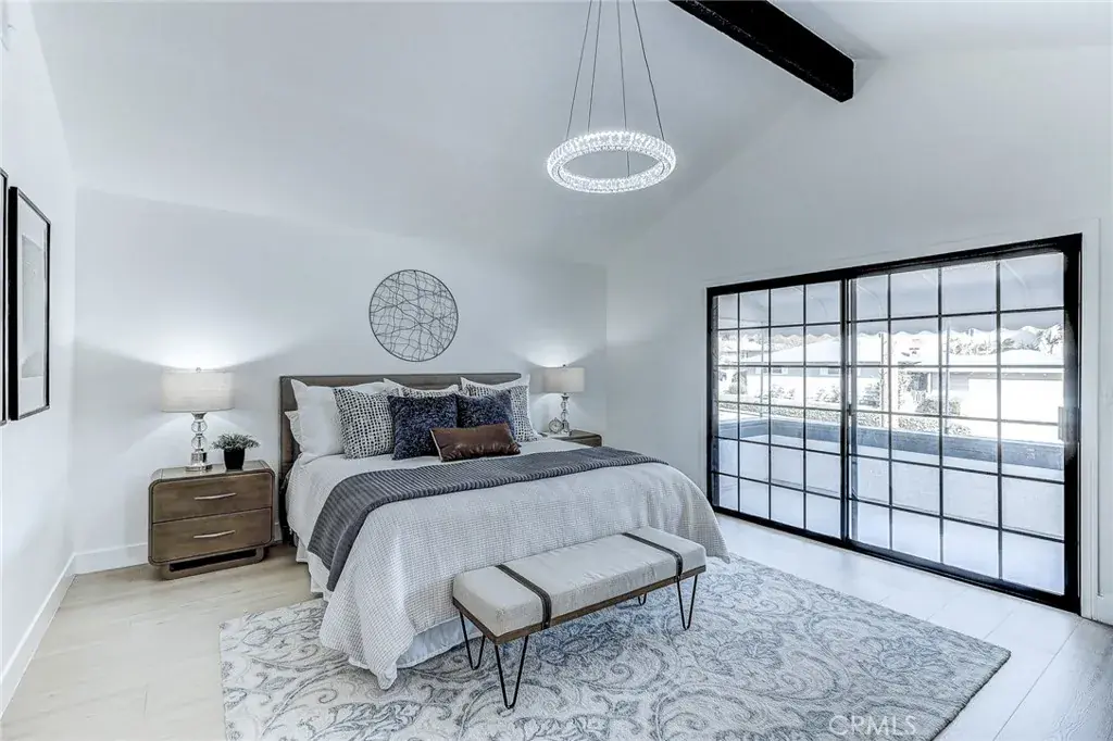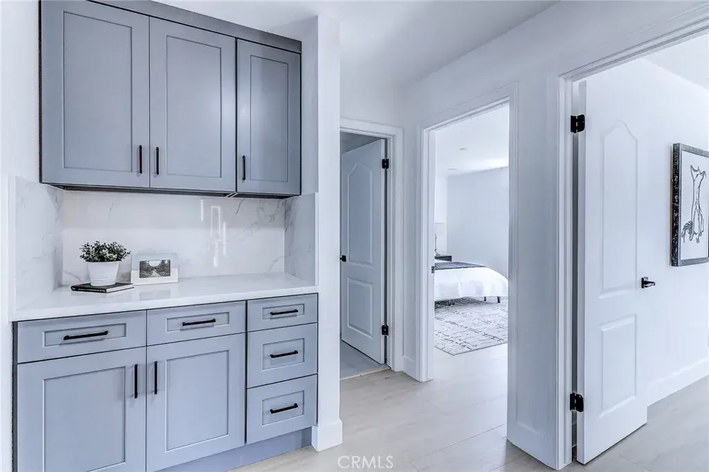 Inside, upgraded wide-plank flooring and soft recessed lighting create a warm yet contemporary ambiance throughout. The thoughtfully designed formal living and dining spaces include a step-down living room adorned with a charming bay window—an inviting setting for intimate gatherings and refined entertaining. At the heart of the home lies a spectacular, fully remodeled chef’s kitchen featuring gleaming quartz countertops, brand-new stainless-steel appliances, custom cabinetry, and a dramatic waterfall island with seating for four. The adjoining breakfast nook overlooks the family room through a sleek glass balustrade and opens seamlessly to the backyard, creating a natural flow between indoor comfort and outdoor leisure.