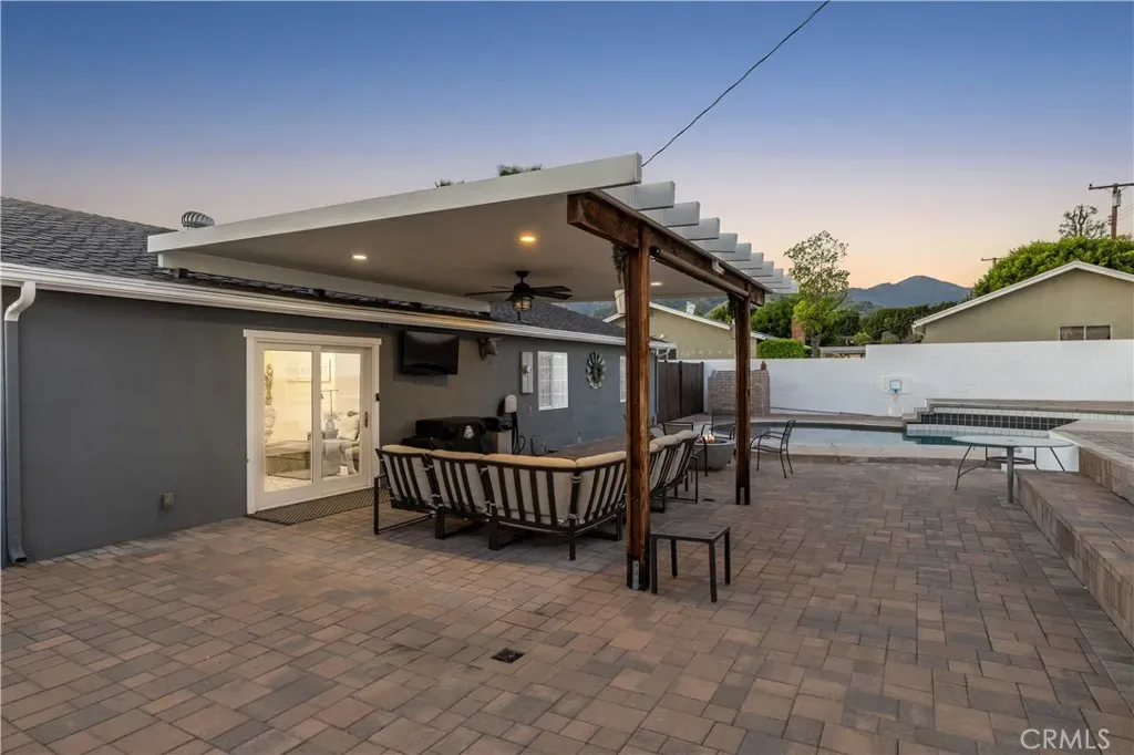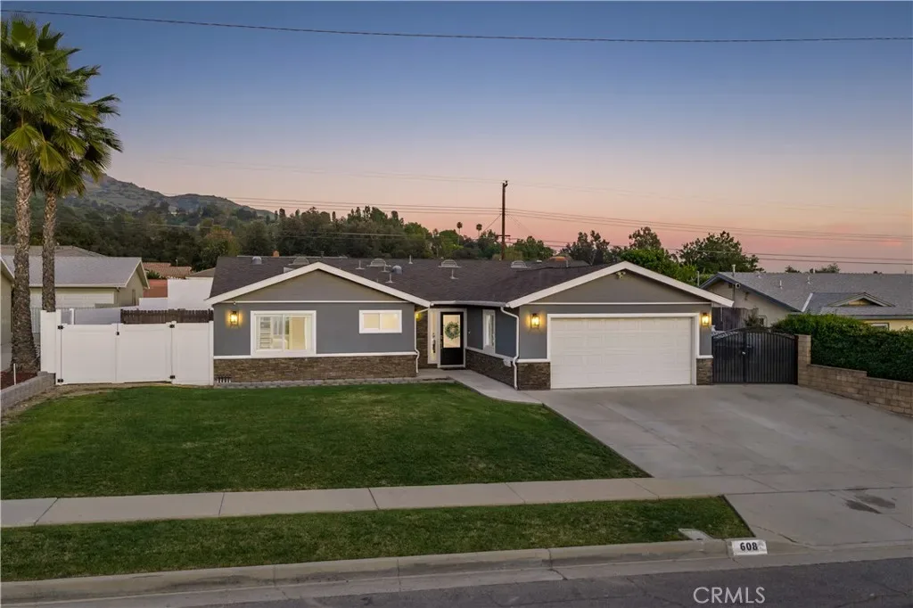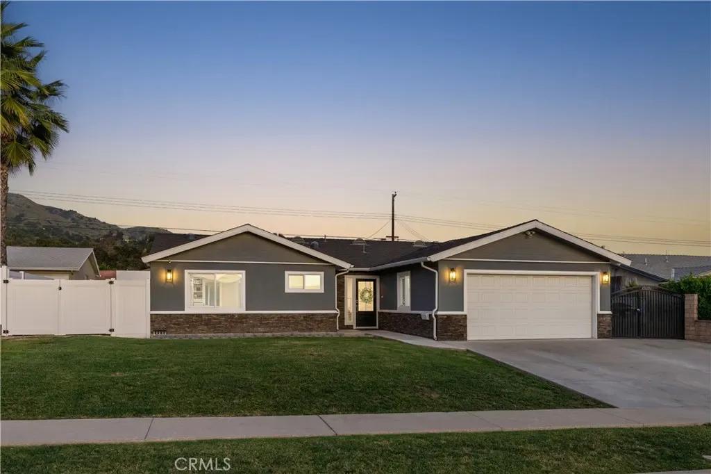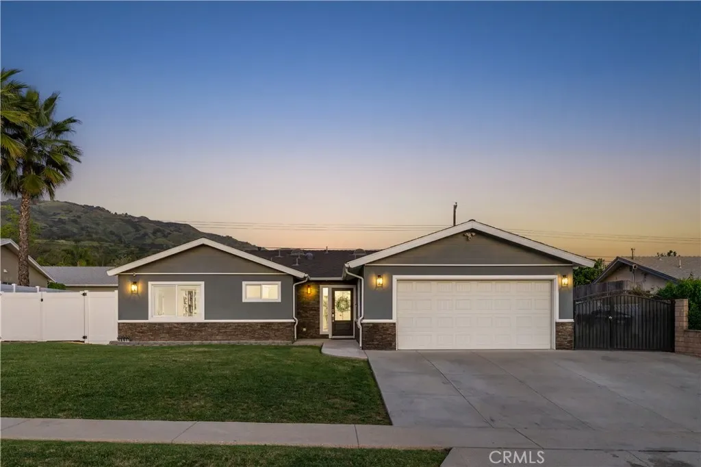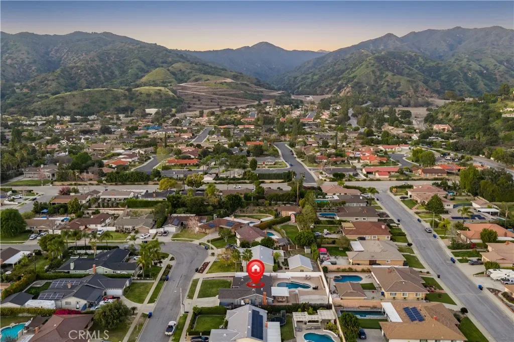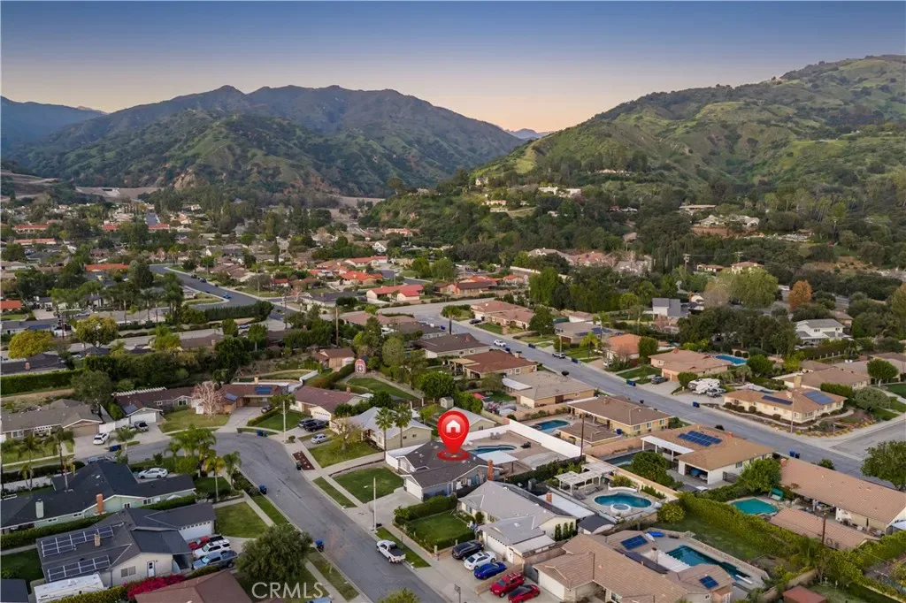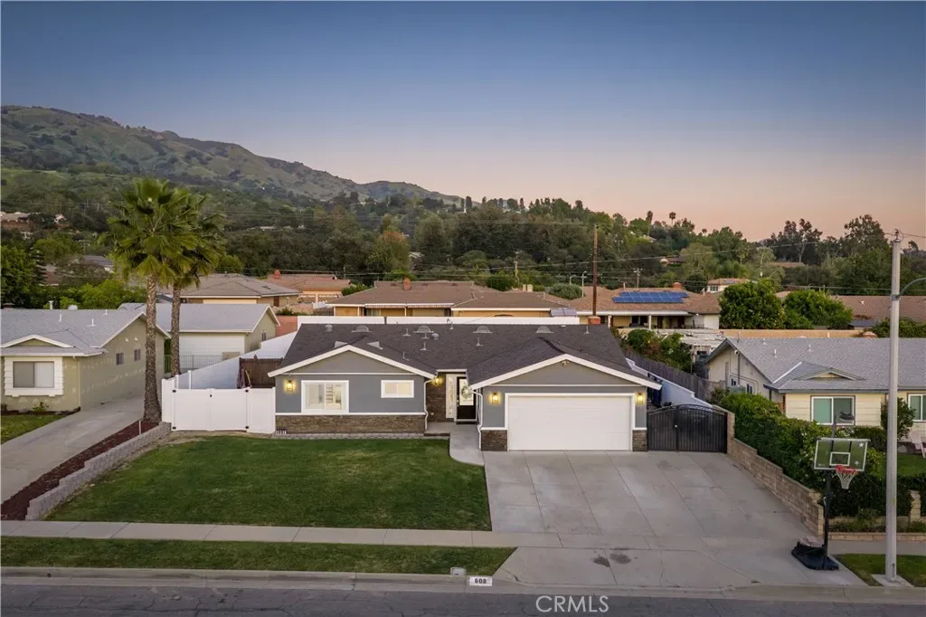 Positioned in a desirable Glendora foothill neighborhood just south of Sierra Madre and within walking distance to Sellers Elementary School, Goddard Middle School, and Glendora High School, this extensively remodeled single-level residence offers an open floor plan, refined finishes, and an expansive lot framed by scenic mountain views. The exterior blends stacked-stone accents and contrasting trim, while a concrete walkway leads to a fiberglass and glass-paneled front door with sidelight opening to a foyer highlighted by crown molding and a shiplap accent wall. The interior opens to a spacious great room anchored by a remodeled kitchen centered around a large island with seating and a sink. White shaker cabinetry, quartz countertops, and a full tile backsplash complement premium appliances including a Bosch gas cooktop, KitchenAid refrigerator, double ovens, and dishwasher. Additional highlights include a coffee bar with a Thermador refrigerator/freezer drawers and an instant hot water dispenser, pendant lighting above the island, recessed lighting, and cabinetry for storage. The kitchen flows seamlessly into the living area where a fireplace with a horizontal mantel creates a focal point and sliding glass doors open to the backyard. The primary suite features recessed lighting and a large window bringing in natural light. A shiplap accent wall adds architectural detail while the en-suite bath includes a dual-sink quartz vanity, framed mirrors, globe lighting, and a glass-enclosed shower with full-height tile and frameless enclosure. A spacious walk-in closet completes the suite. Two additional bedrooms offer windows overlooking the backyard and surrounding foothills, while the hall bathroom includes a dual-sink quartz vanity and glass-enclosed tile shower. A dedicated laundry room provides cabinetry and a utility sink. The backyard is designed for both relaxation and recreation, featuring expansive paver decking surrounding a pebble-finish pool with elevated backsplash, concrete coping, Baja shelf, and three umbrella ports, perfect for entertaining. A covered patio with wood post-and-beam supports and an Alumawood roof provides shaded outdoor living with recessed lighting and a ceiling fan. Multiple terraced areas expand the outdoor space, including an upper sport court ideal for pickleball or basketball. Additional features include gated RV parking with a 240V plug and sewer cleanout, upgraded electrical panel, updated HVAC system, and a 30-year roof.